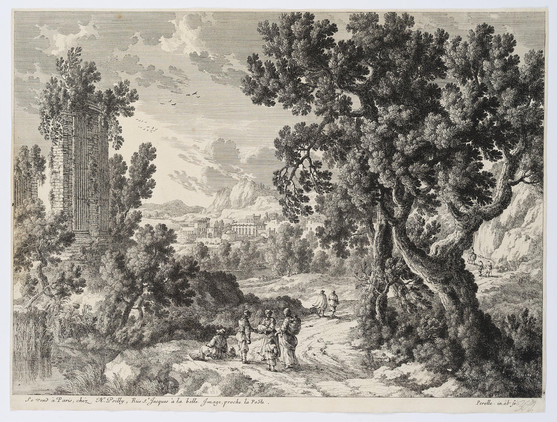- Inscription: Lower middle signed: “Se vend à Paris, chéz N. Poilly, Rüe S.t Jacques à la belle Image, proche la Poste.”, Perelle . in et fé .””. Inscribed and signed below the image in the printing plate: “Se vend à Paris, chéz N. Poilly, Rüe S.t Jacques à la belle Image, proche la Poste.”, Perelle . in et fé .”