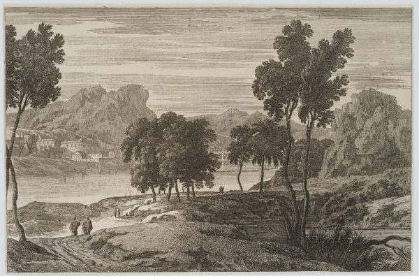 Gabriel Perelle (1604 Vernon or Orléans – 1677 Paris), View of a Mediterranean river landscape with a city fortification on the opposite bank and strolling staffage figures, , Etching