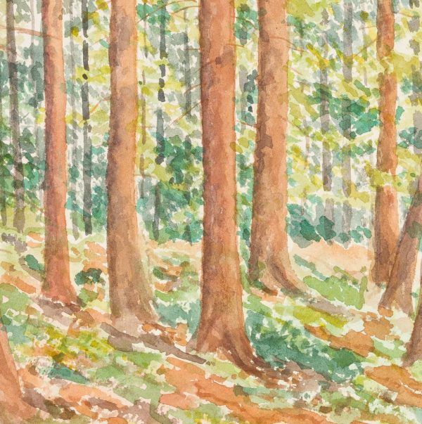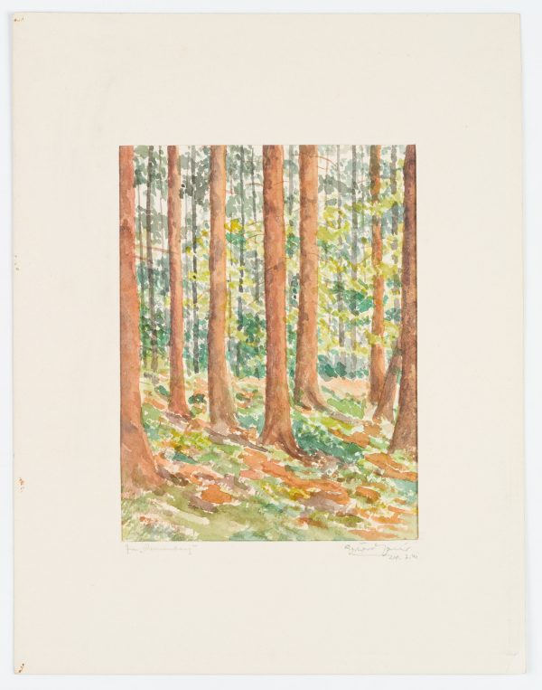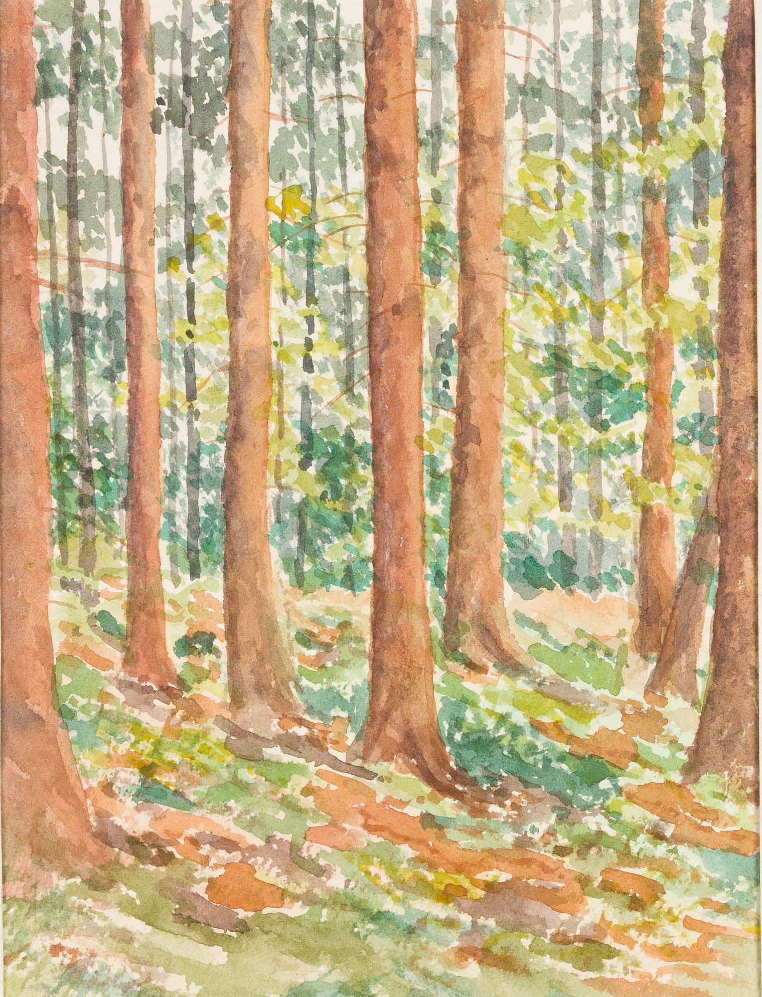Gerhard Sauer (20th century), Gerhard SAUER, Woodland View of high tree trunks, 1941, , Watercolor