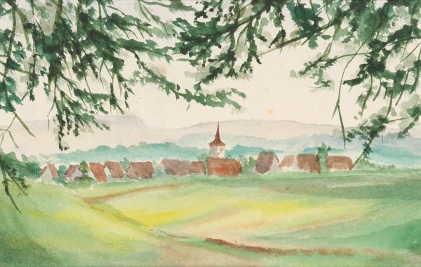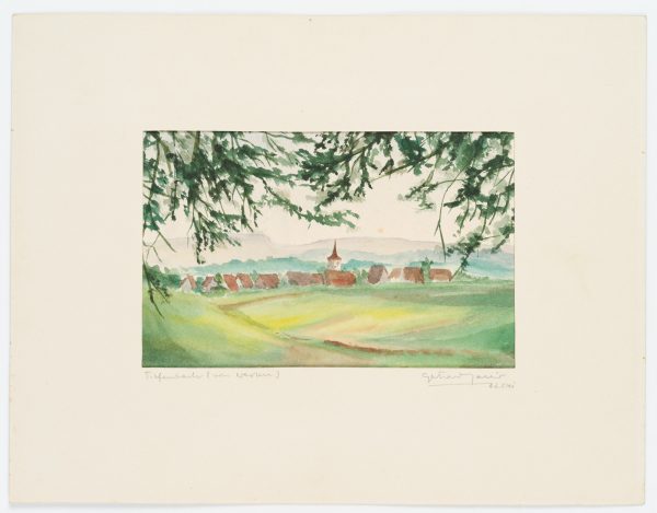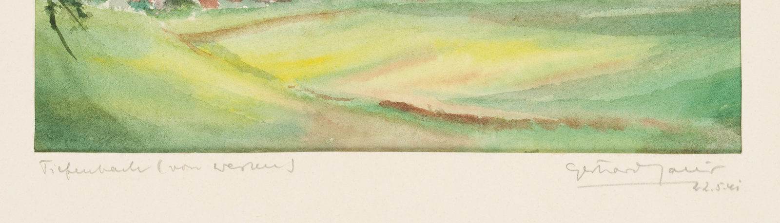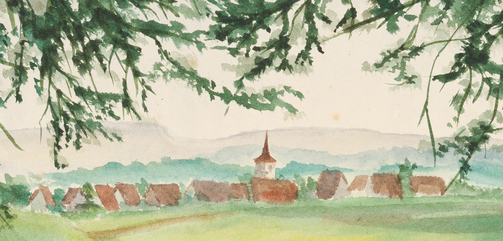 - Description: Signed, dated and inscribed on the front of the passepartout frame. From a folder with watercolours, drawings and studies by Gerhard Sauer with views of nature and landscapes of different seasons from the southern German region of Baden-Württemberg: Near Tiefenbach, Hartfeld, Schönmünz, Leimiß. Mostly the artist shows idyllic views of small villages with farms and church tower silhouettes, embedded in hilly natural landscapes. The dramatic events of the forties do not appear in Sauer’s work. Please note our other offers.