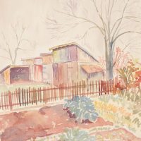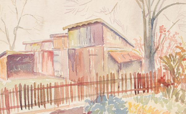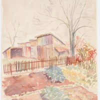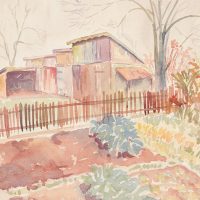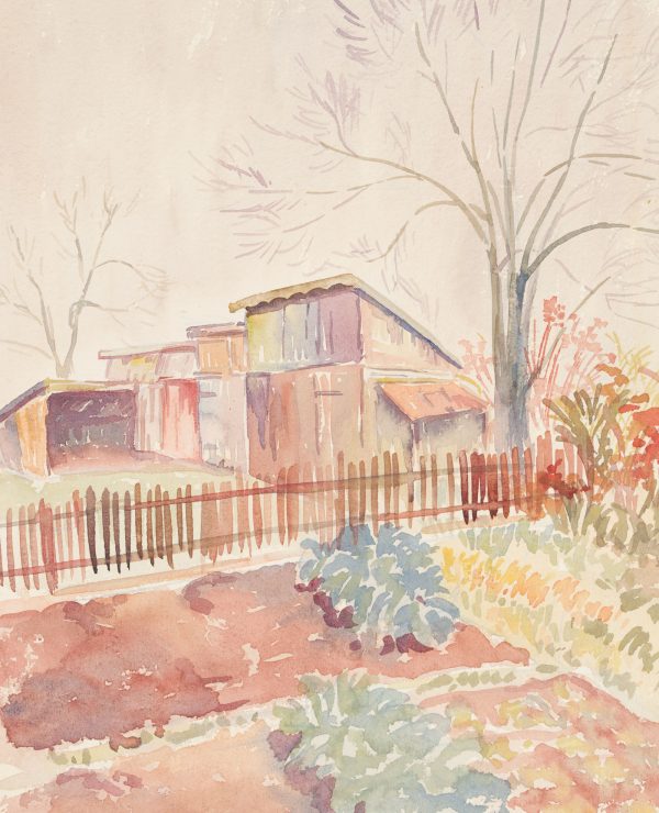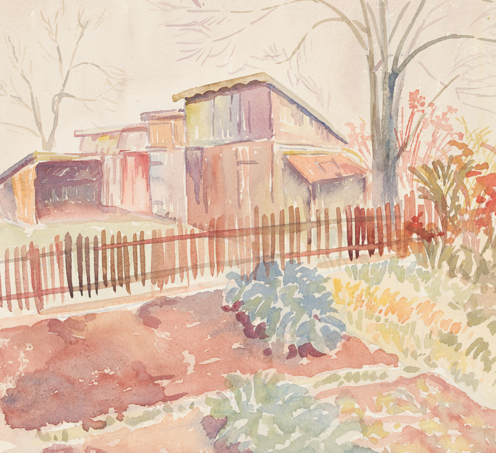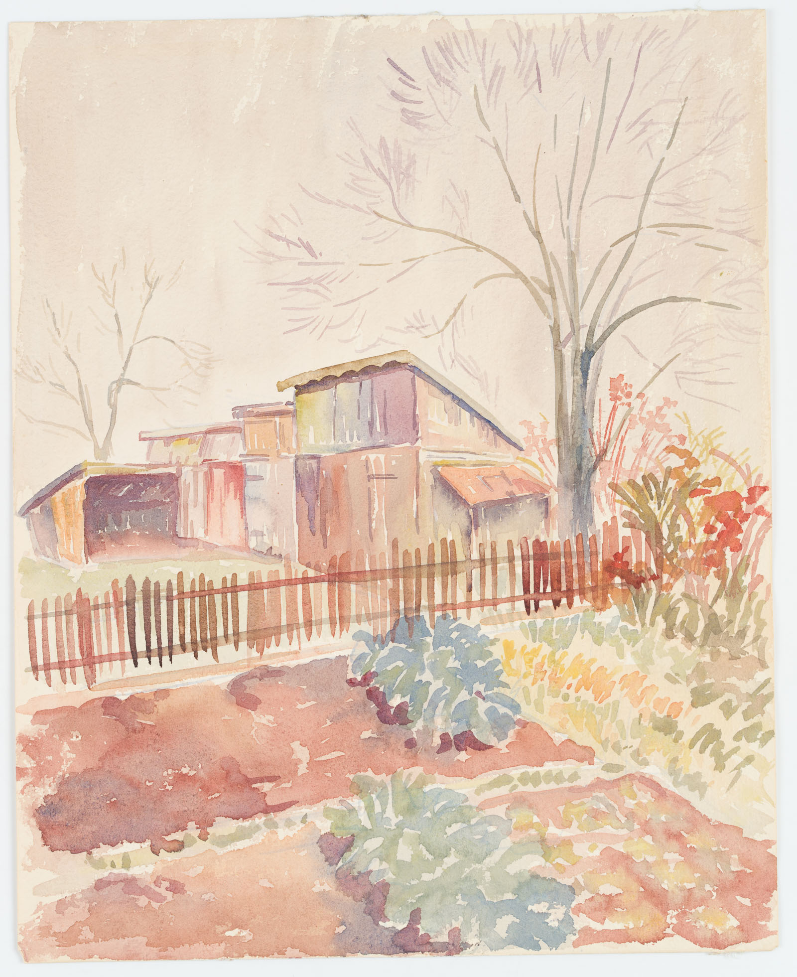 Gerhard Sauer (20th century), SAUER, Garden with well-tended beds bordered by a fence, c 1945, Aqua, c. 1945, Watercolor