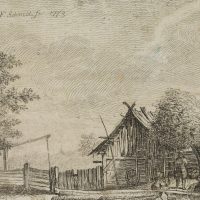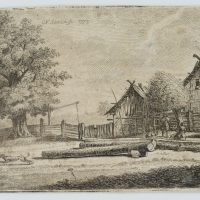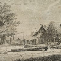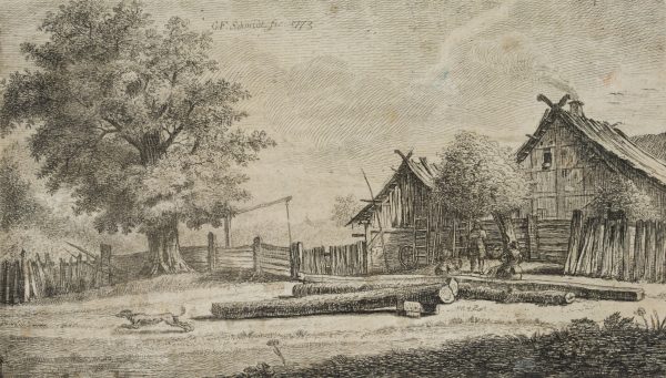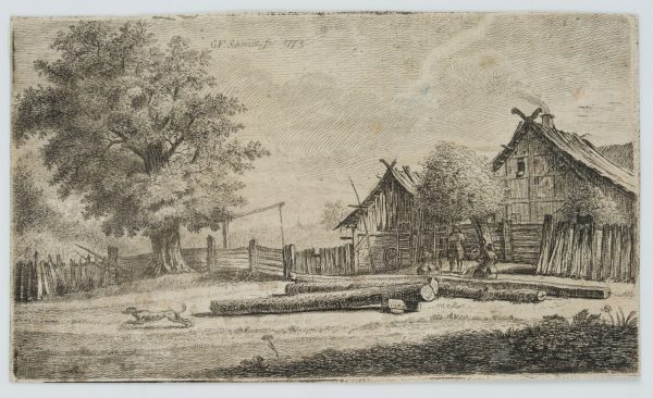 - Description: Rustic landscape with the artist’s birthplace. Three figures sit under a tree in front of felled trees. On the left a dog is fleeing.