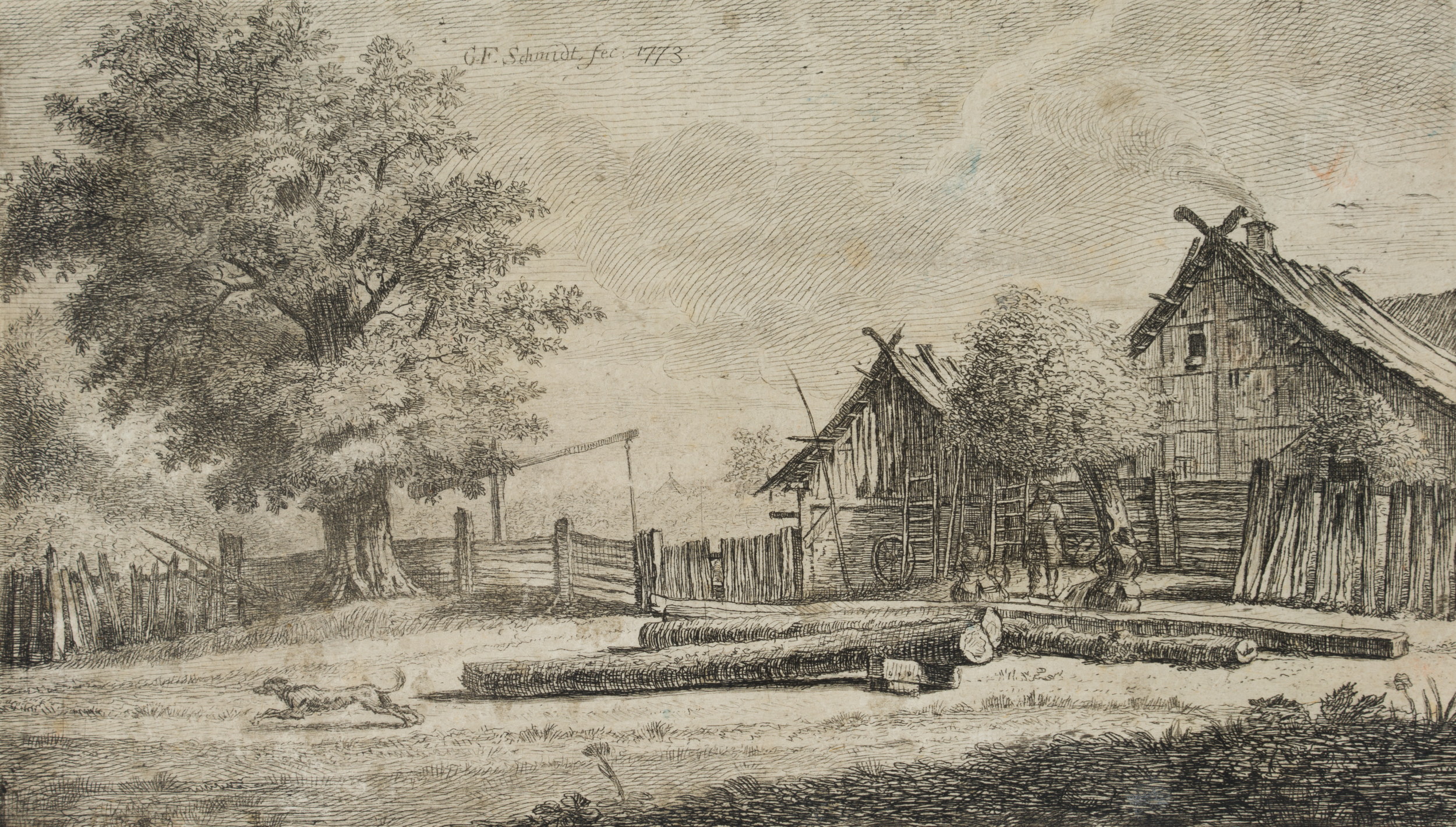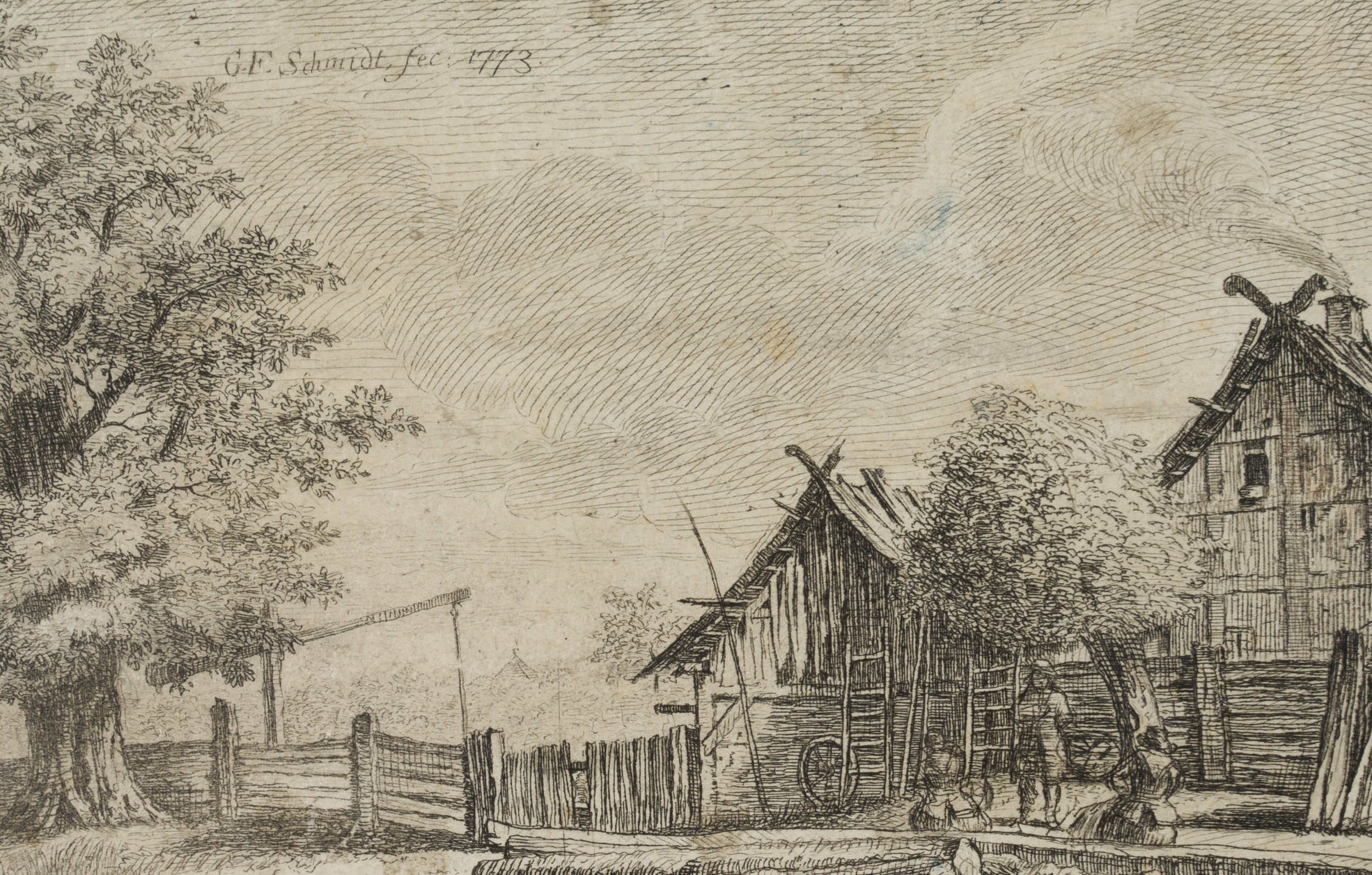Georg Friedrich Schmidt (1712 Schönerlinde – 1775 Berlin), Landschaft mit dem Geburtshaus des Künstlers, 1773, Radierung
