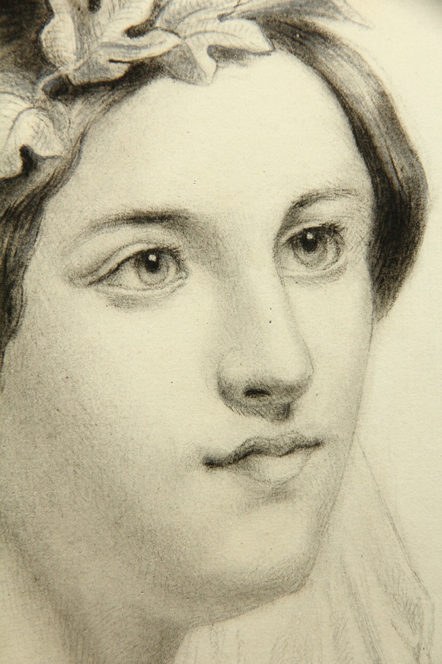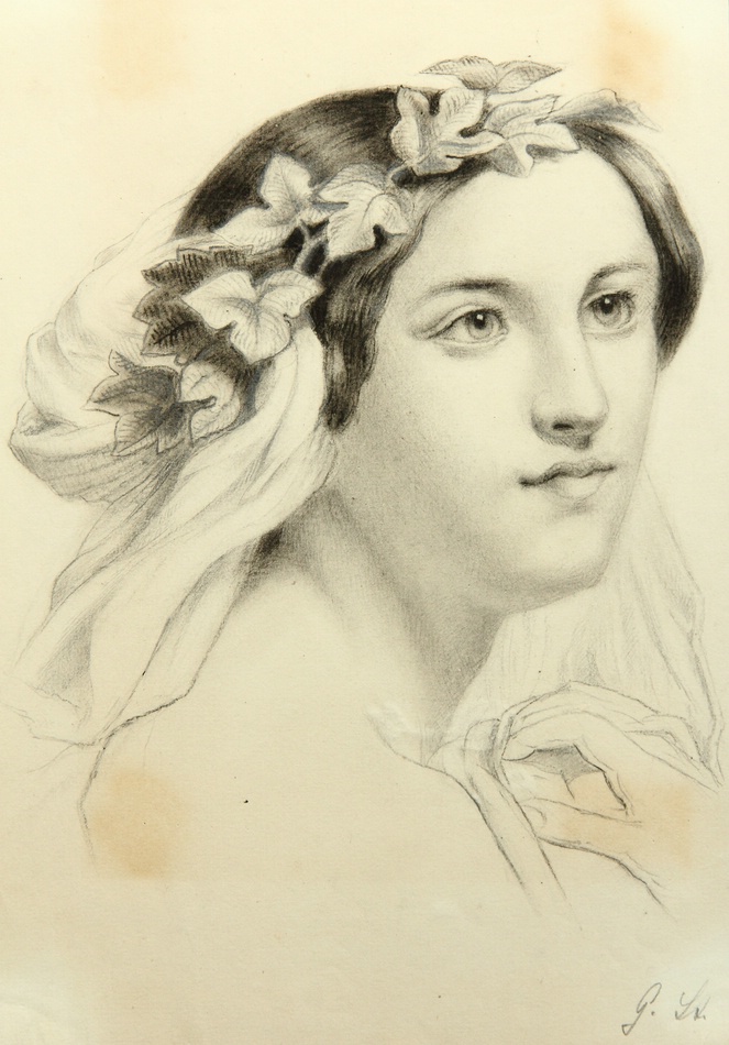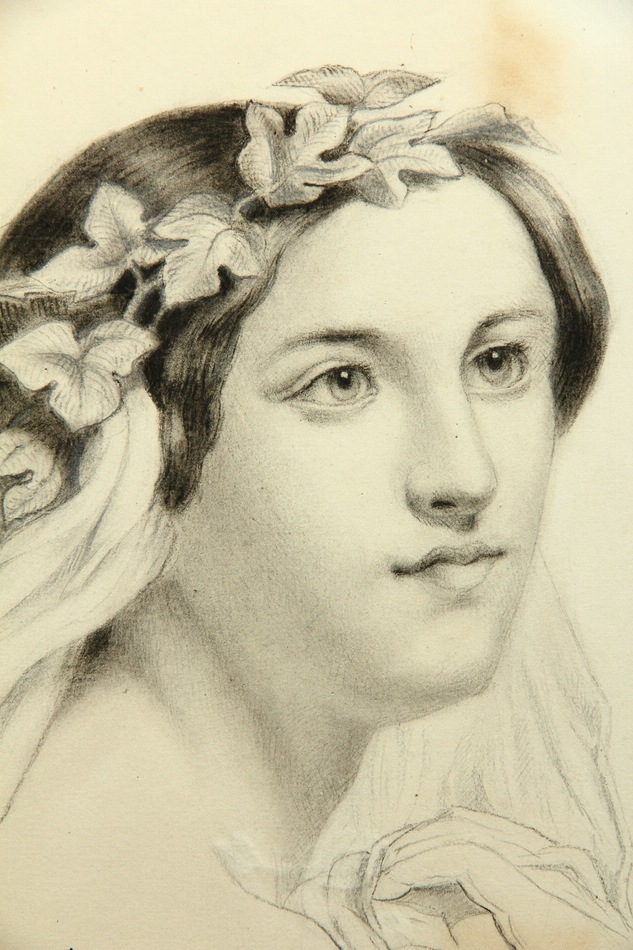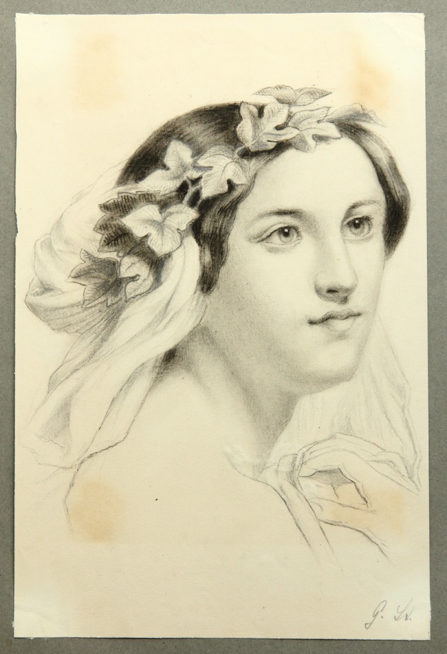 - Description: Masterly portrait drawing of a young woman in half profile. On her hair she wears a wreath of ivy as well as a white, loosely laid scarf. For drawings with the same model, please also note our further offer.