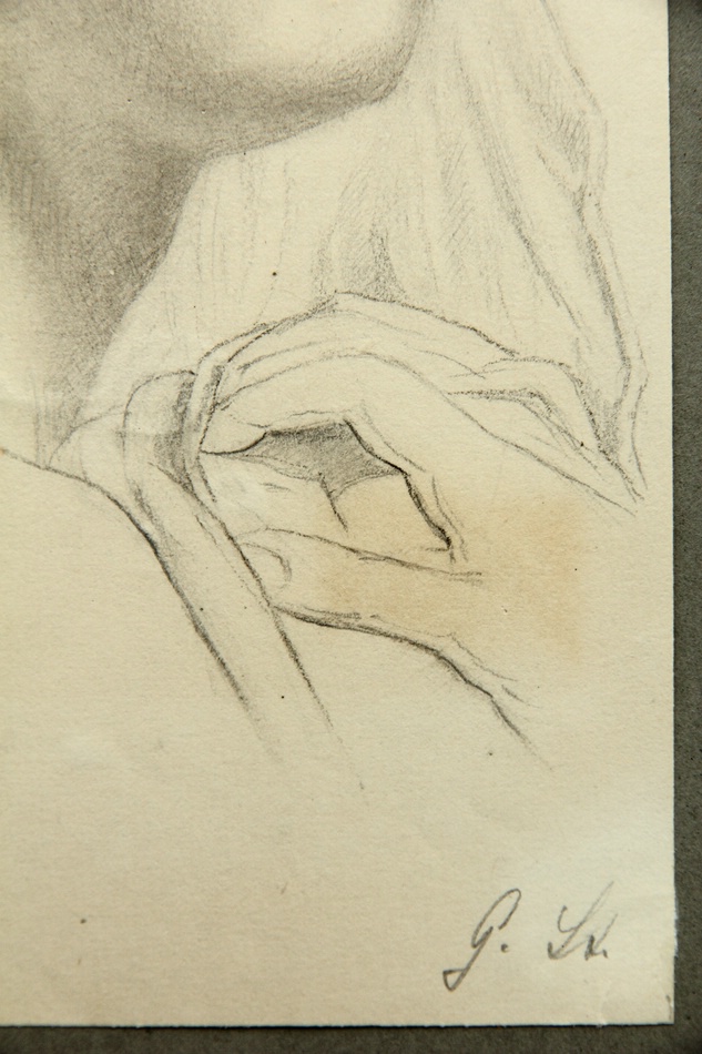 - Beschreibung: Meisterhafte Porträtzeichnung einer jungen Frau im Halbprofil. Auf dem Haar trägt sie einen Kranz aus Efeu sowie ein weißes, lose gelegtes Tuch. Beachten Sie zu Zeichnungen mit demselben Modell auch unser weiteres Angebot.