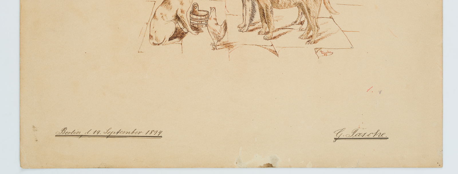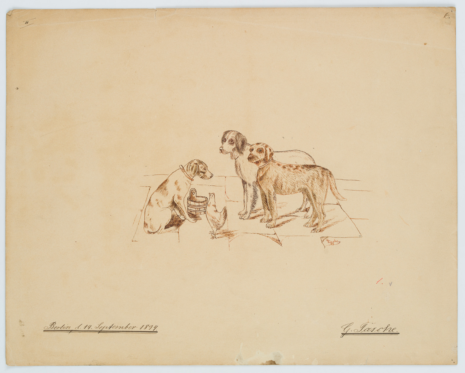 G. Tasche (19th century), POCKET, Small Dog Meeting with Hen, 1894, 19th century, Indian ink