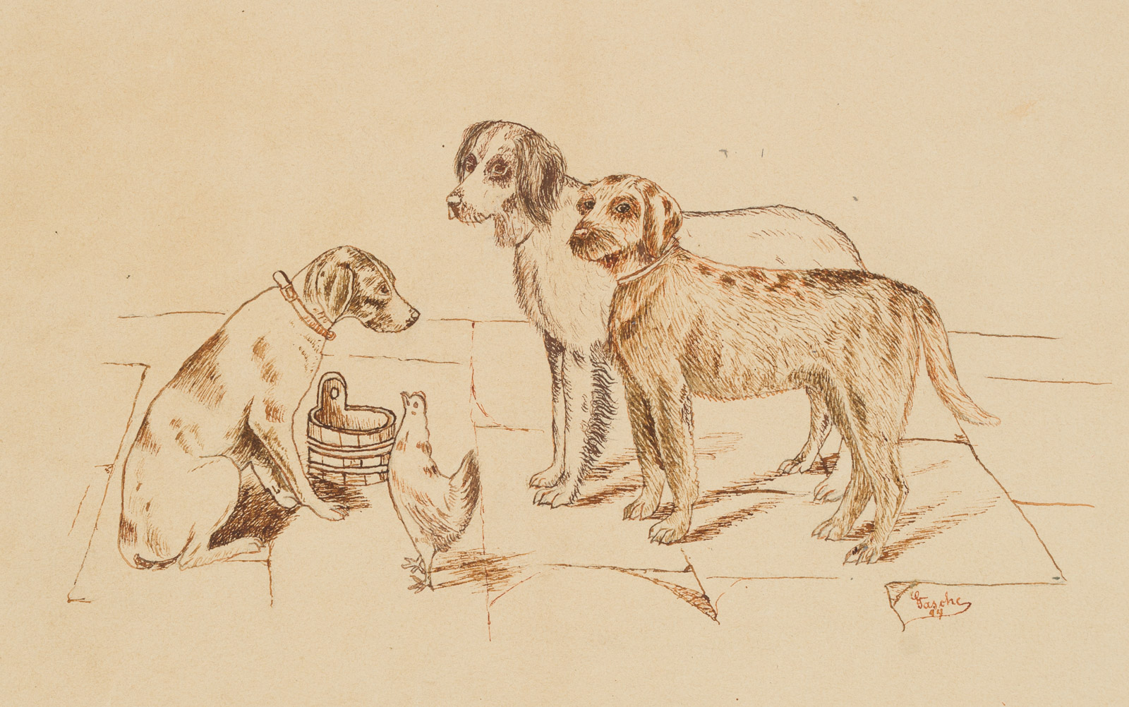 G. Tasche (19. Jahrhundert), TASCHE, Kleine Hundeversammlung mit Henne, 1894, 19. Jahrhundert, Tusche