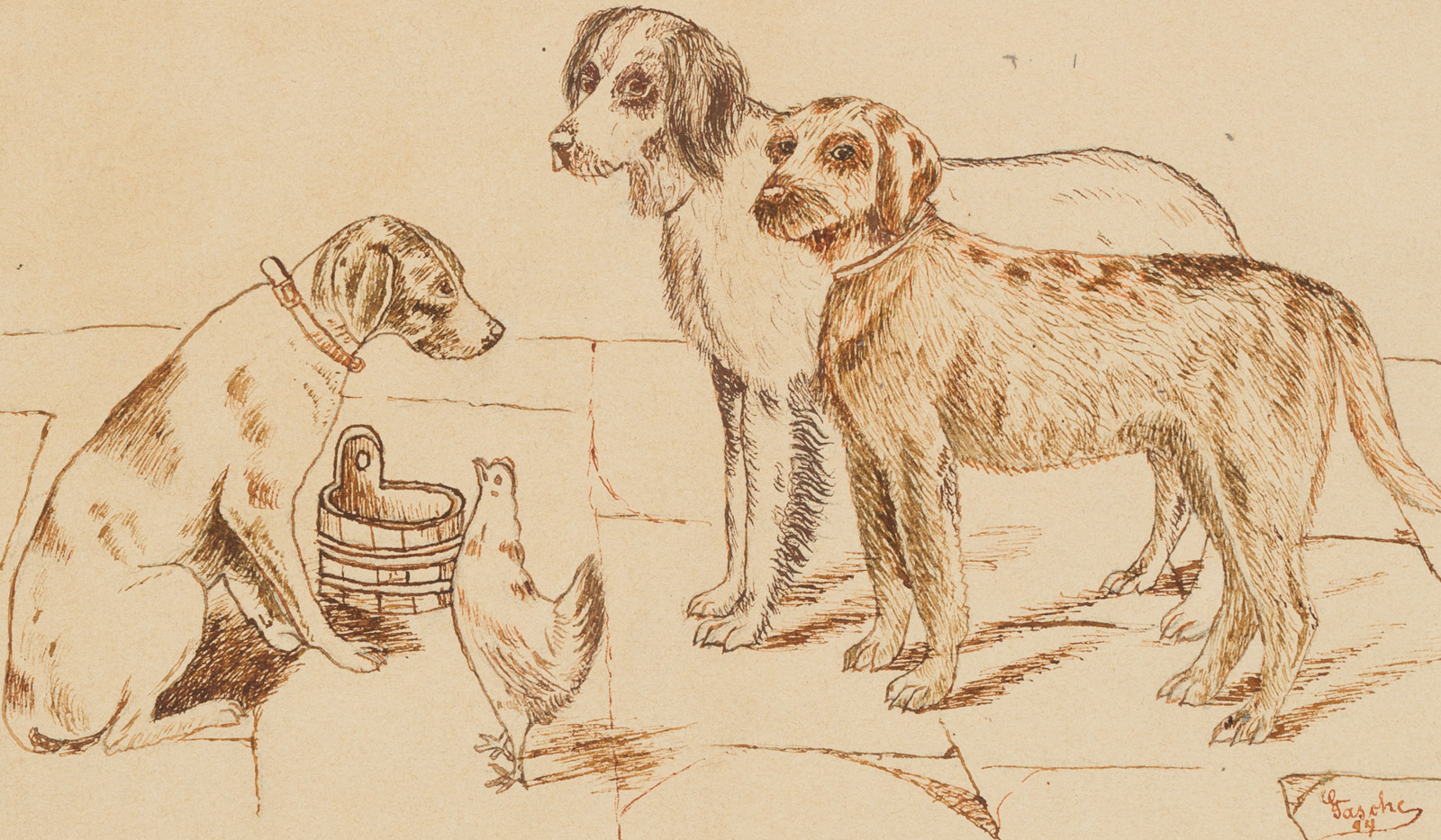 - Description: Gathering of three dogs in the courtyard with water trough and hen. Signed and dated both on the right below the drawing and on the lower margin of the sheet