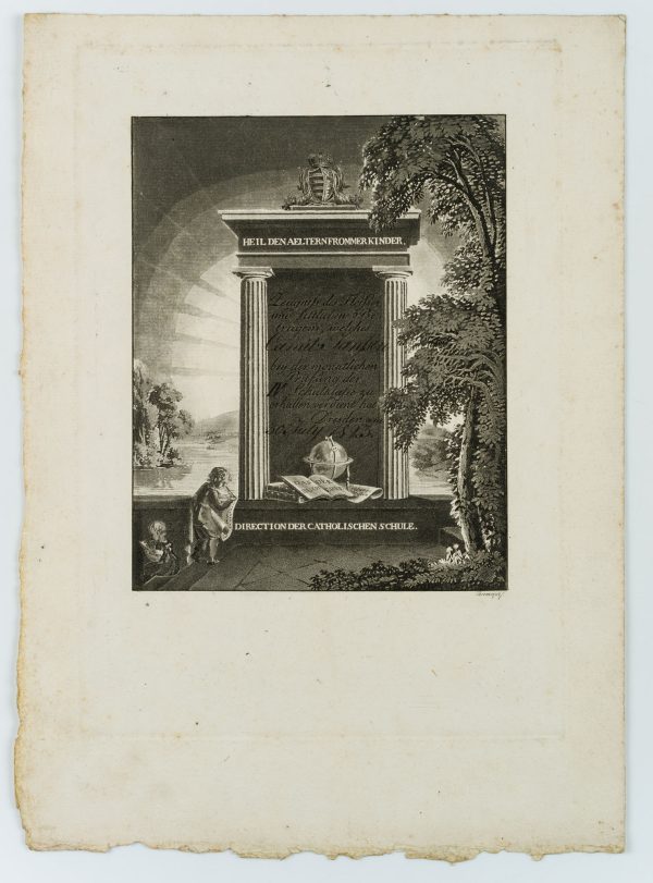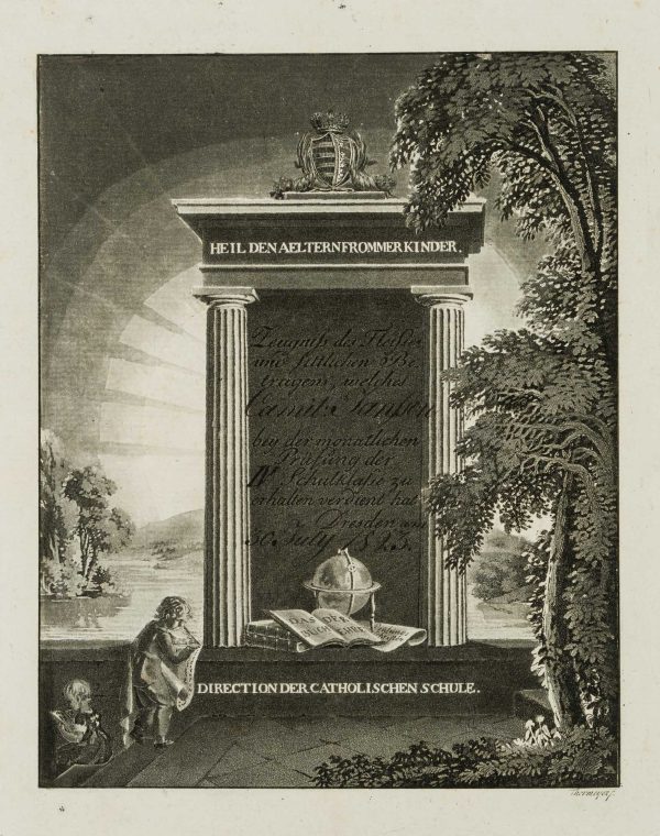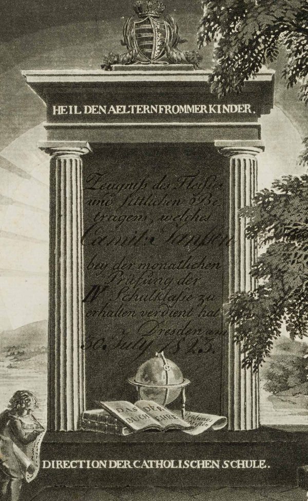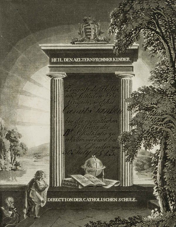- Inscription: Signed “Thormeyer s.” in the lower right corner of the printing plate. Titled, dated and inscribed in the image: “Heil den Aeltern frommer Kinder / Zeugnis des Duches und sittlichen Betragens, welches Camille Janssen bei der monatlichen Prüfung der IV. Schulklasse zu erhalten hat / Dresden am 30. July 1823 / Direction der Catholischen Schule.