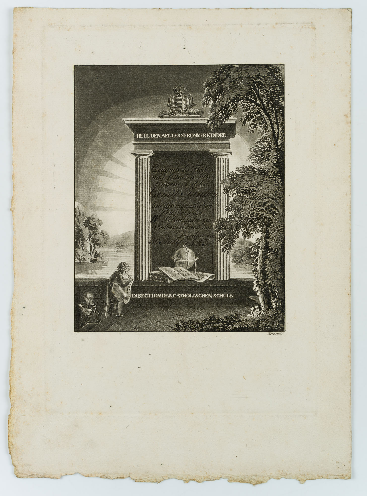 - Bezeichnung: Rechts unten in der Druckplatte signiert mit “Thormeyer s.”. In der Darstellung betitelt, datiert und bezeichnet: “Heil den Aeltern frommer Kinder. / Zeugnis des Fleißes und sittlichen Betragens, welches Camille Janssen bei der monatlichen Prüfung der IV. Schulklasse zu erhalten verdient hat / Dresden am 30. July 1823. / Direction der Catholischen Schule.”.