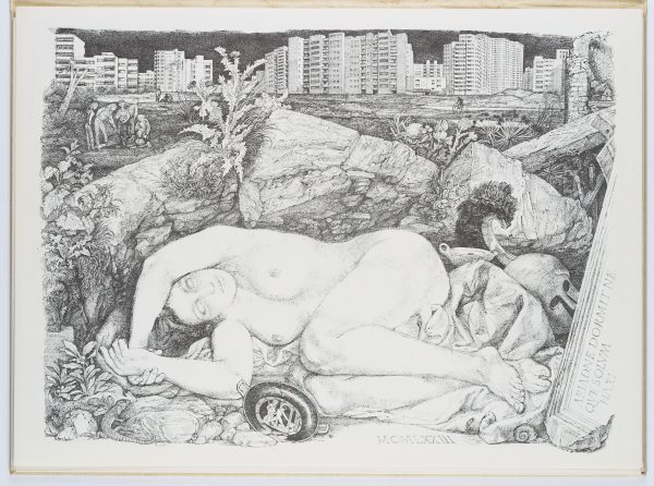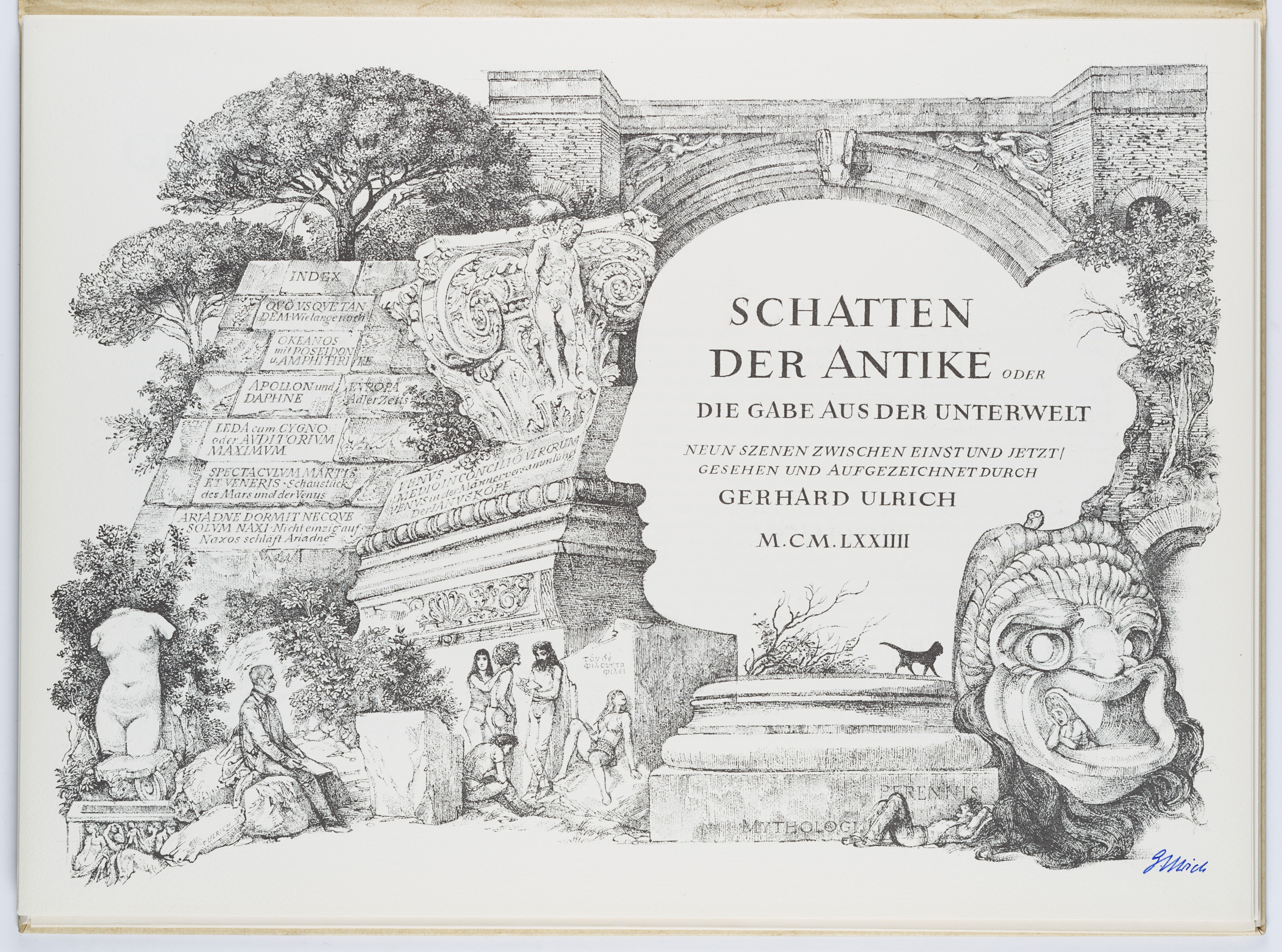 Gerhard Ulrich (1903 Berlin – 1988 Gütersloh), Schatten der Antike oder Die Gabe aus der Unterwelt. Neun Szenen zwischen einst und jetzt| Gesehen und aufgezeichnet durch Gerhard Ulrich M.CM.LXXIIII, 1974, Offsetdruck