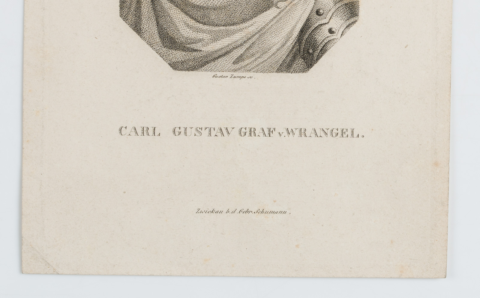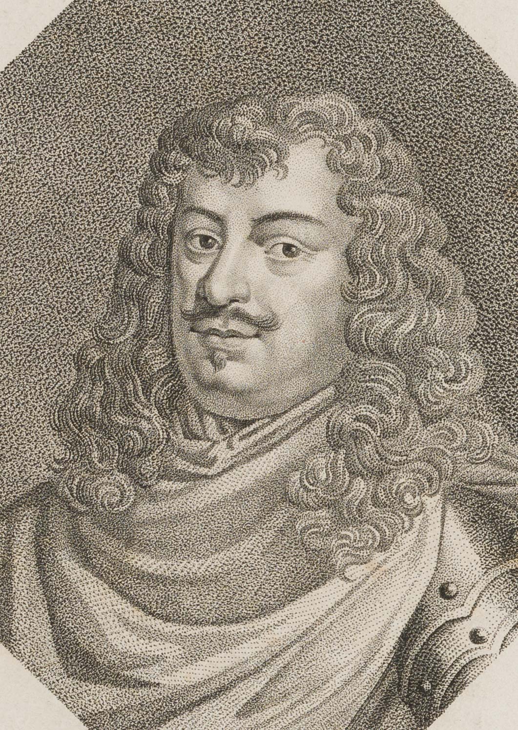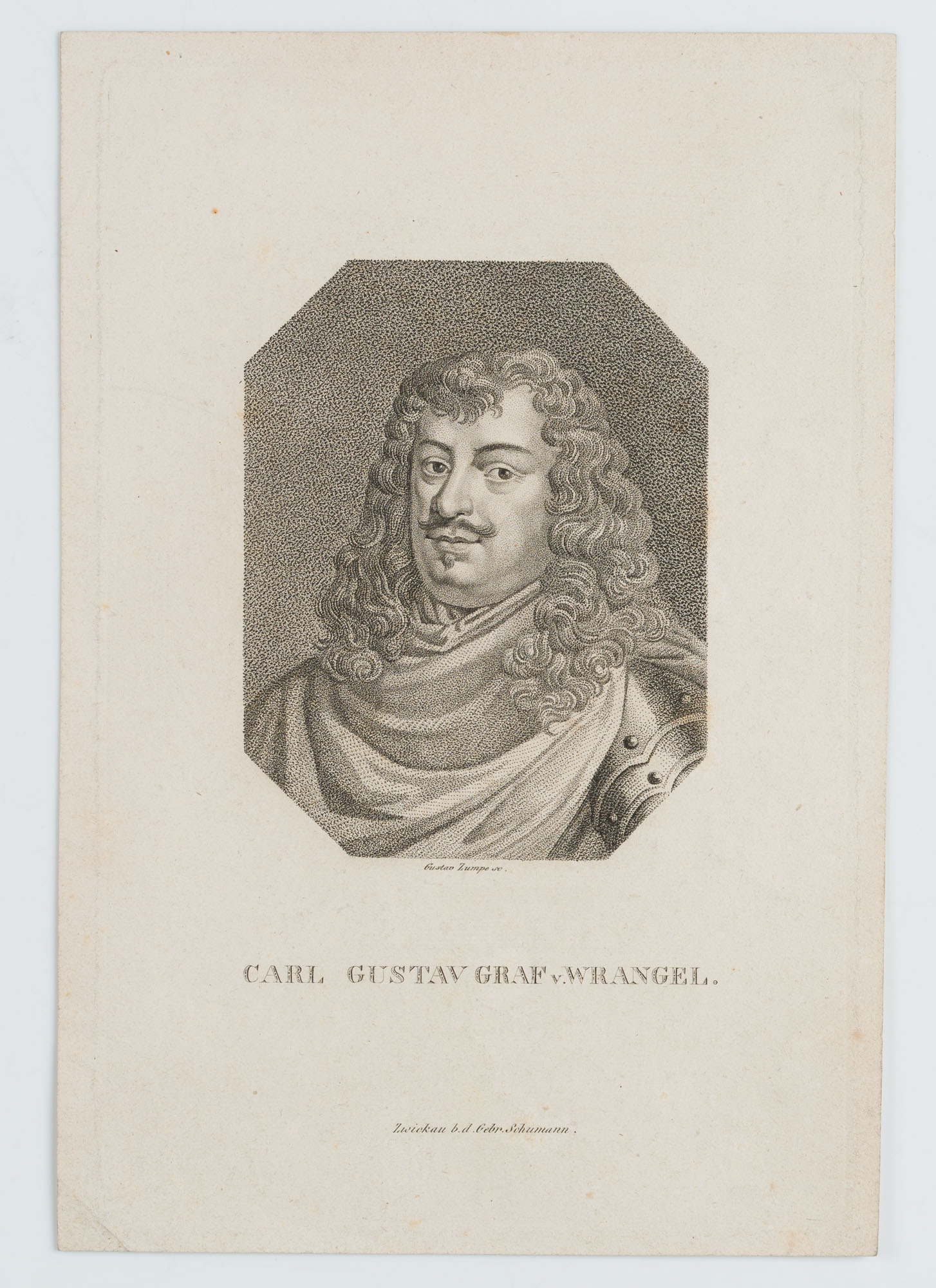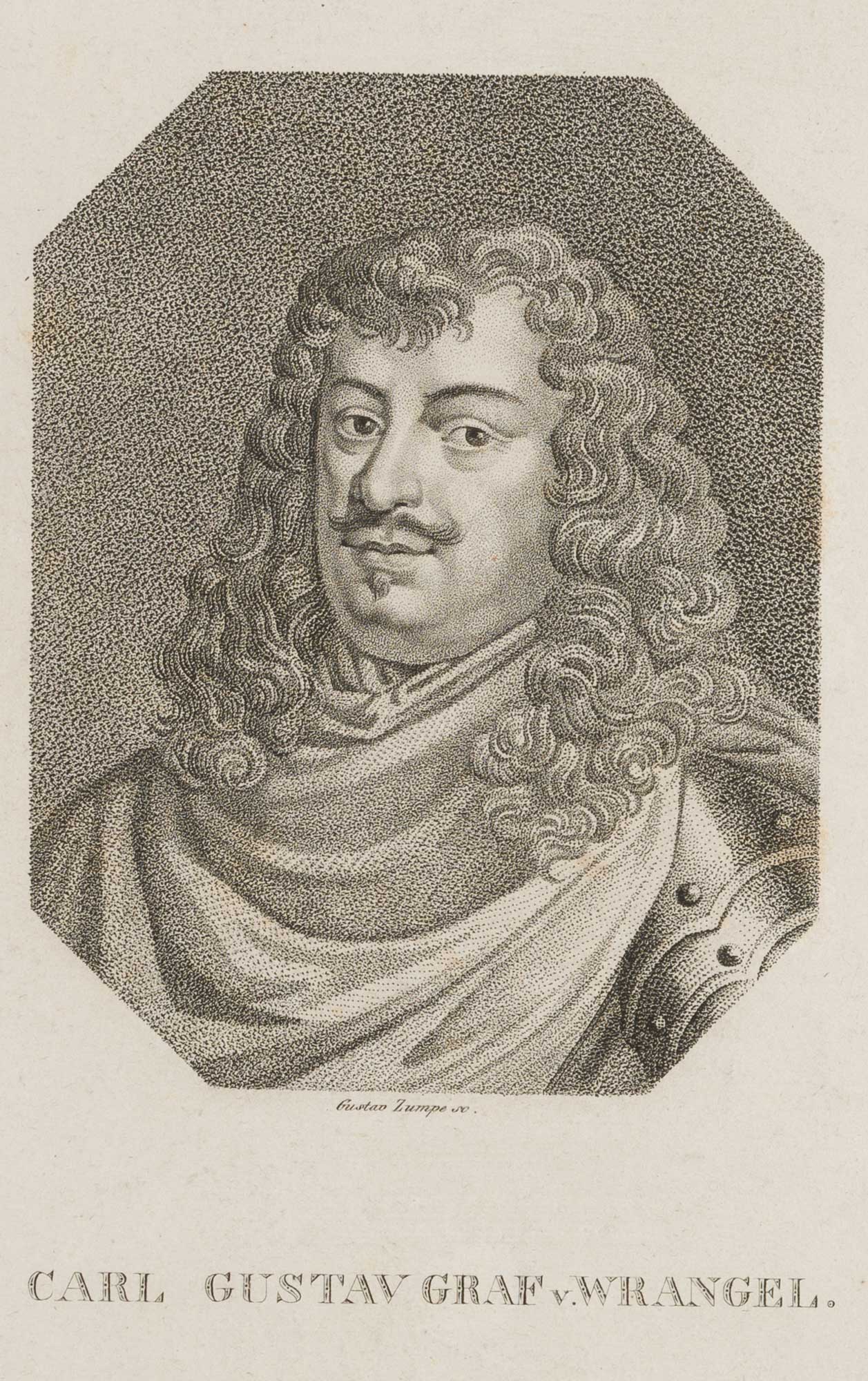 Gustav Adolph Ludwig Zumpe (1793 Dresden – 1854 ebd.), Portrait des Carl Gustaf Graf v. Wrangel (1613 – 1676), schwedischer Feldmarschall und Staatsmann, Bruststück im Dreiviertelportrait nach links im Harnisch mit langem gelocktem Haar, 19. Jahrhundert, Punktierstich