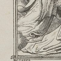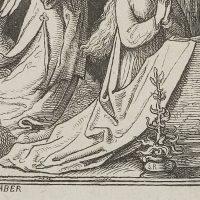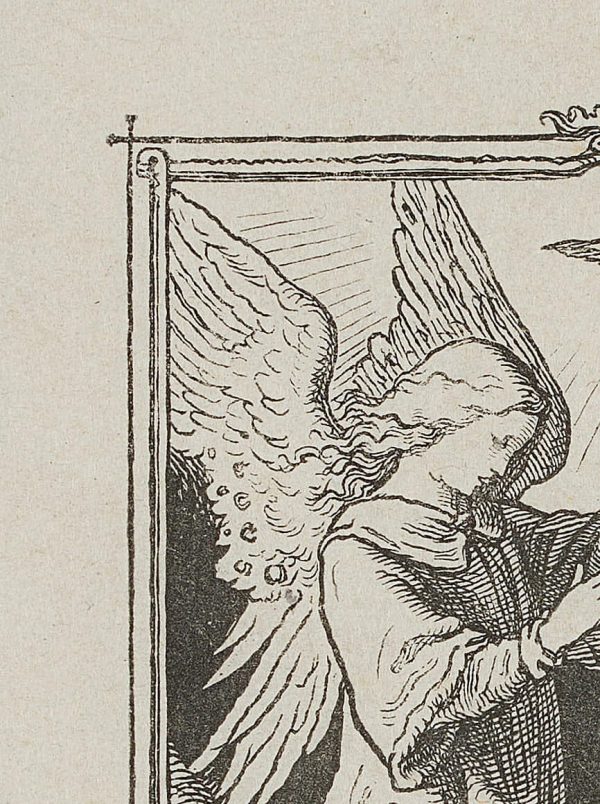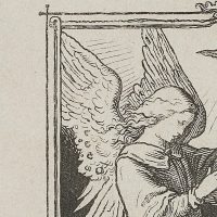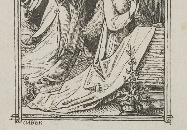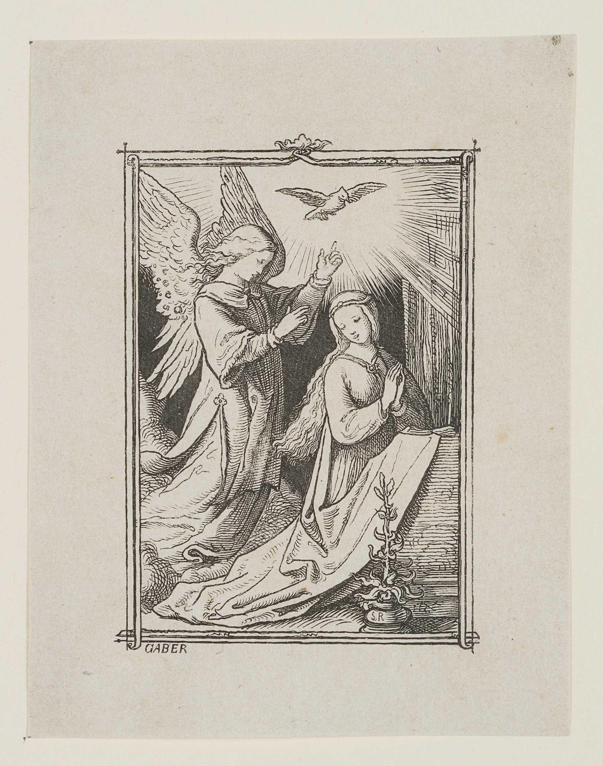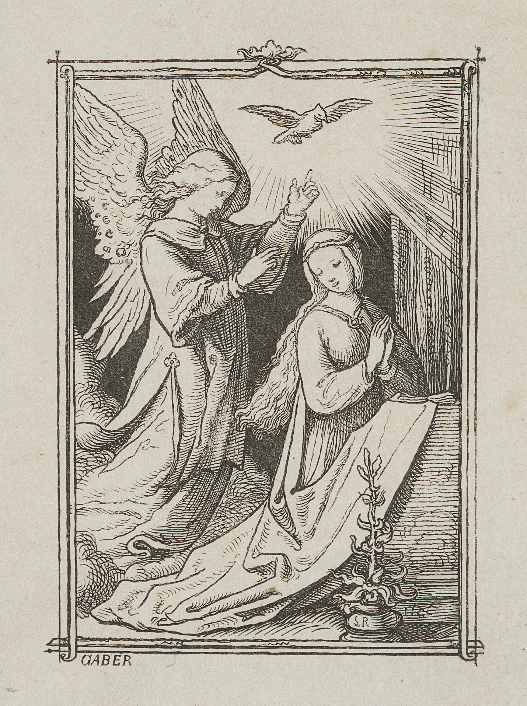 August Gaber (1823 Köppernig bei Neisse (Nysa)/Schlesien – 1894 Berlin) nach Ludwig Richter (1803 Dresden – 1884 ebd.), An der Krippe zu Bethlehem, Titelbild. Maria mit dem Engel Gabriel, Probedruck, 1852, Holzstich