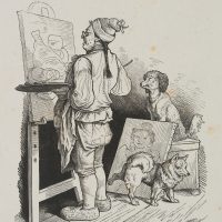 - Description: Satirical scene in the studio of a painter. The master stands in front of an unfinished still life while one of his two dogs urinates against a portrait standing on the floor.
