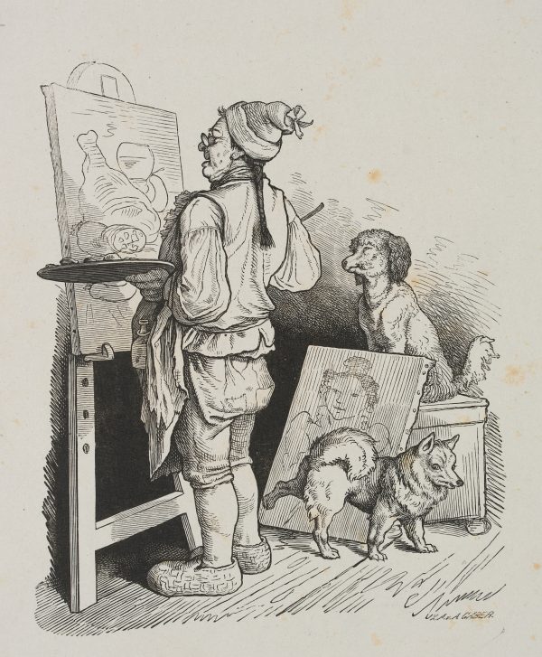 August Gaber (1823 Köppernig near Neisse (Nysa)/Silesia – 1894 Berlin) after Ludwig Richter (1803 Dresden – 1884 ibid.), Master Connoisseur and Critic, Painter with Two Dogs, proof print, 1856, Wood engraving