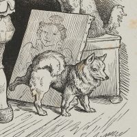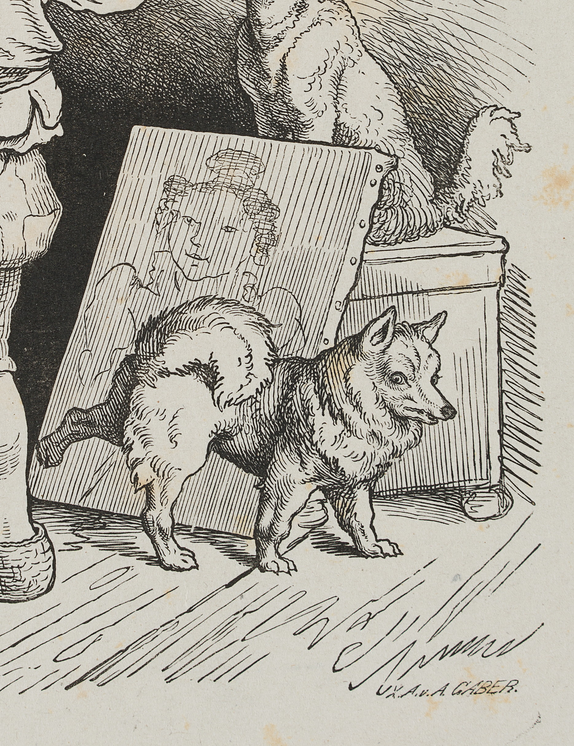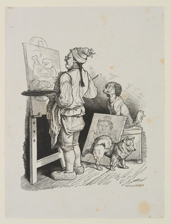 - Beschreibung: Satirische Szene im Atelier eines Malers. Der Meister steht vor einem unfertigen Stillleben, während einer seiner zwei Hunde gegen ein am Boden stehendes Porträt uriniert.