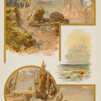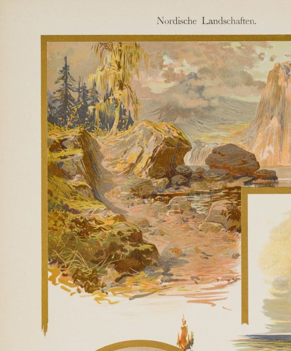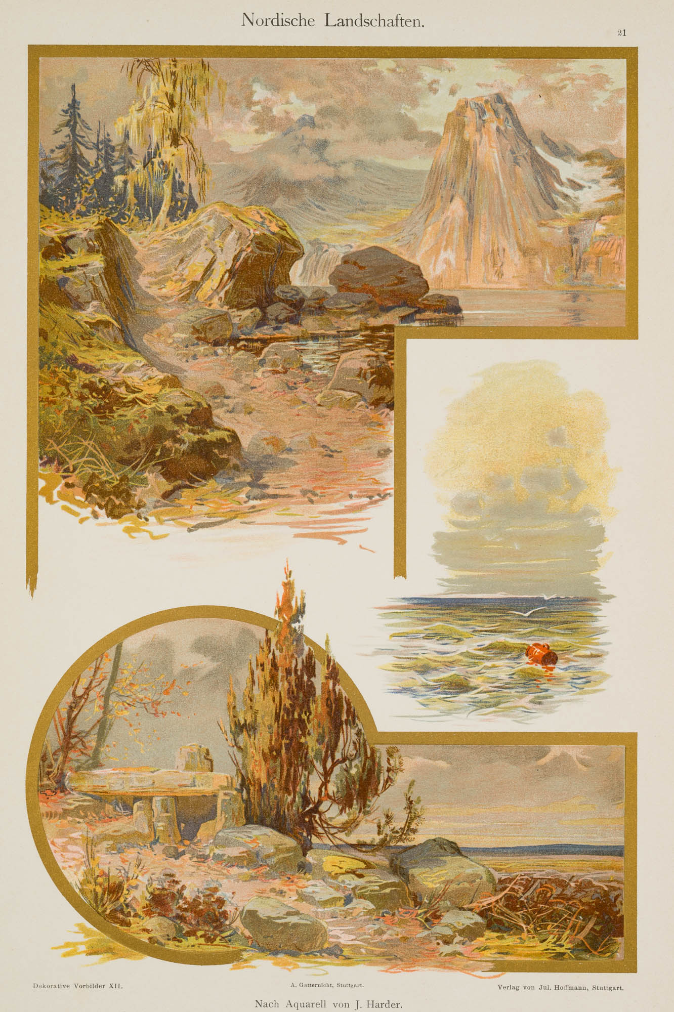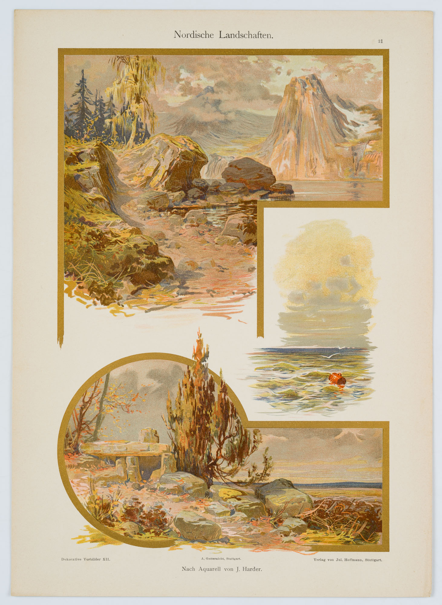 Adam Gatternicht (1819 Heidelberg – 1899 ) after Johannes Harder (1792 – 1873 ), Nordic landscapes after watercolour by J. Harder, from: Decorative Models XII, published by Julius Hoffmann, Stuttgart, c. 1900, Colour lithography