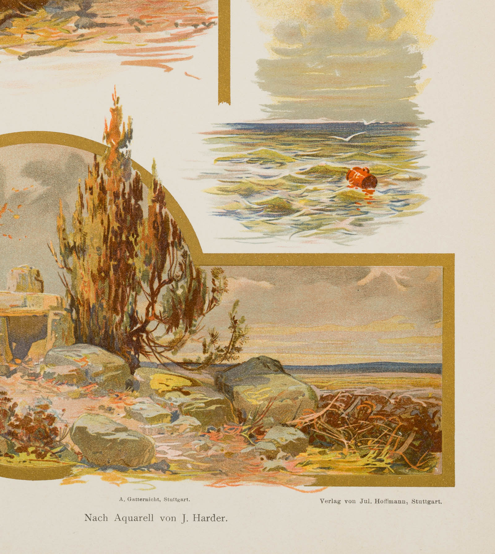 Adam Gatternicht (1819 Heidelberg – 1899 ) nach Johannes Harder (1792 Kopenhagen – 1873 Soroe), Nordische Landschaften nach Aquarell von J. Harder, aus: Dekorative Vorbilder XII., Verlag Julius Hoffmann, Stuttgart, um 1900, Farblithographie