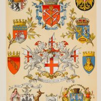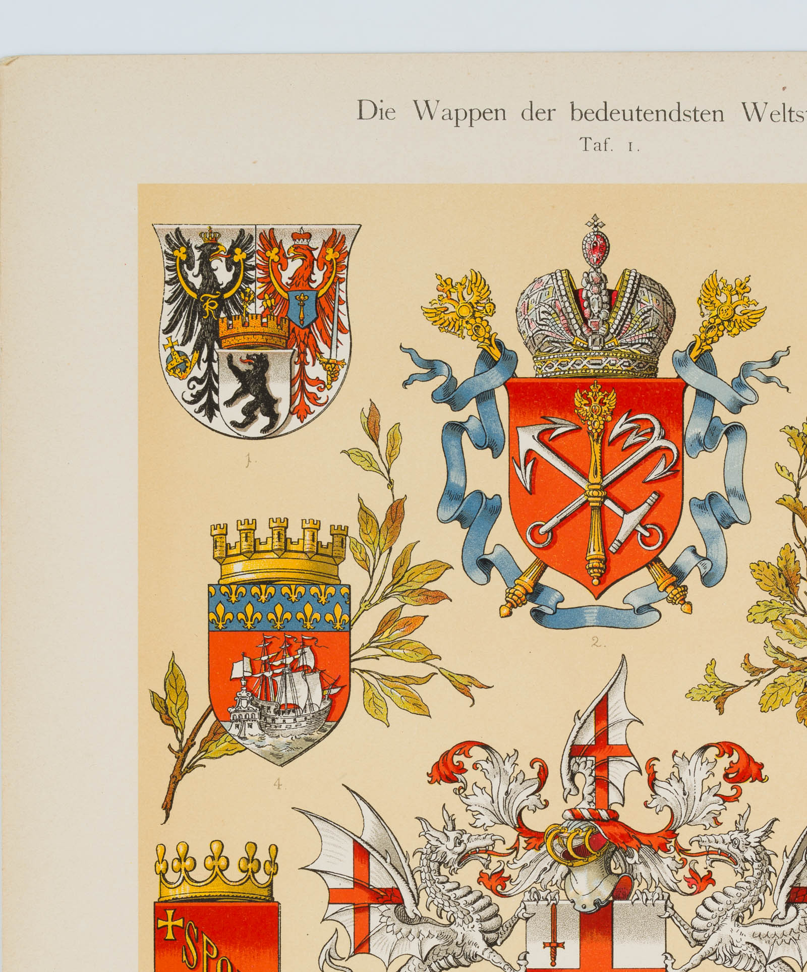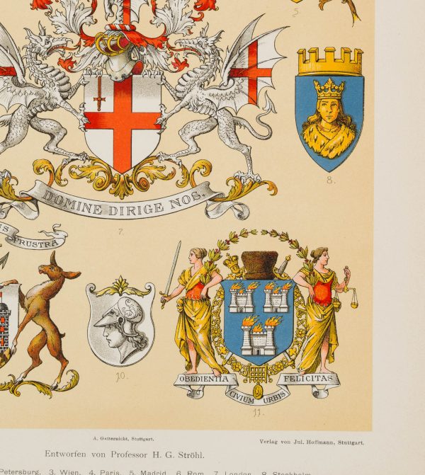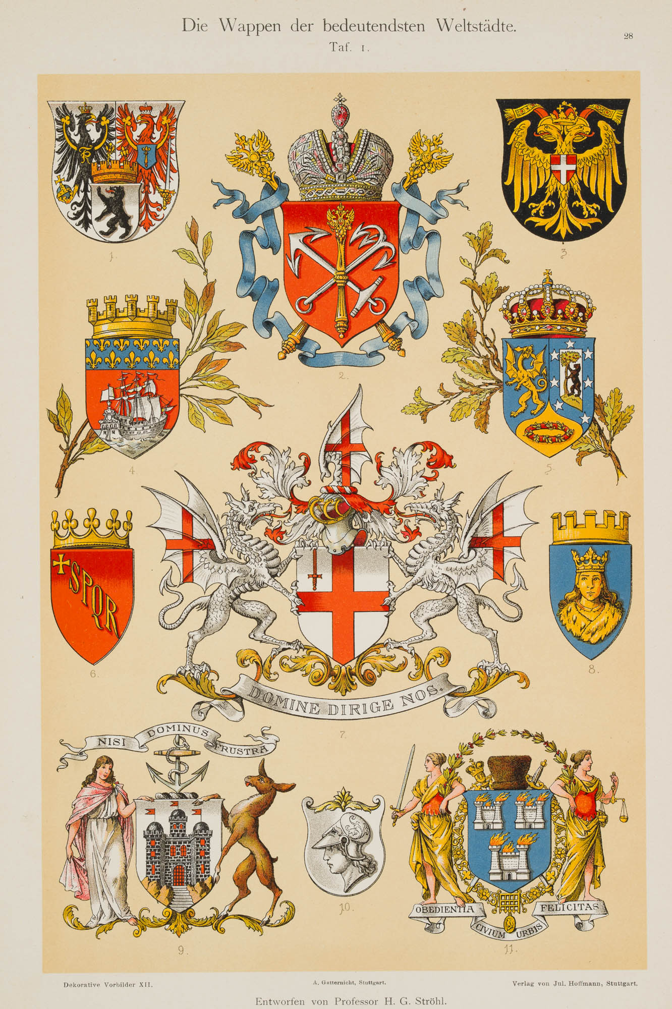 Adam Gatternicht (1819 Heidelberg – 1899 ) nach Hugo Gerard Ströhl (1851 Wels – 1919 Mödling), Die Wappen der bedeutensten Weltstädte, Taf. I., Berlin, Paris, Rom , London Athen, um 1900, Lithographie, aus: Dekorative Vorbilder XIX., Verlag Julius Hoffmann, Stuttgart, um 1900, Farblithographie