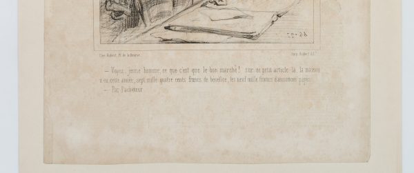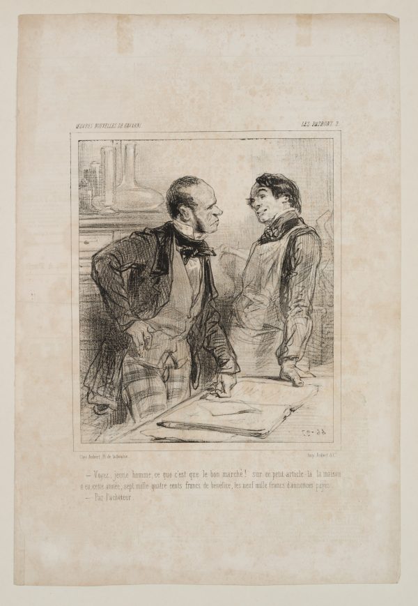 - Description: Caption. Translated from the French: “- You see, young man, this is a very good example of a good deal! On the basis of this little advertisement, the house had made seven thousand four hundred francs this year, the nine thousand francs for the advertisement – paid by the buyer.