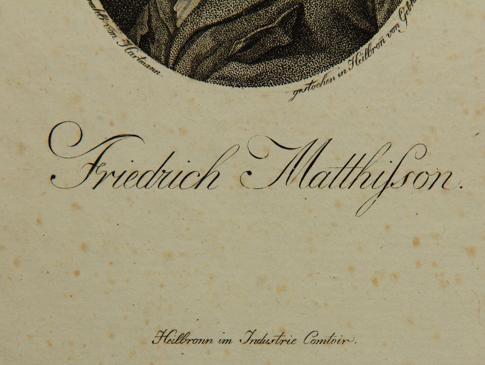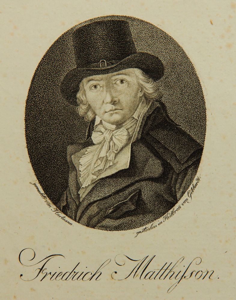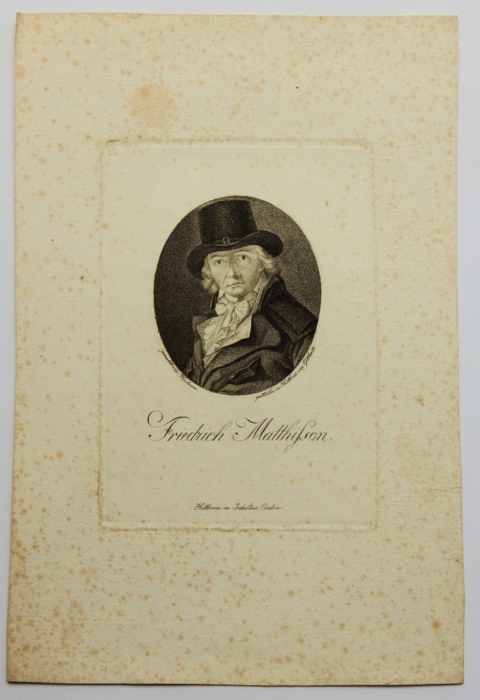- Beschreibung: Porträt des Friedrich Matthisson (1761 Hohendodeleben bei Magdeburg – 1831 Wörlitz), Schriftsteller und Lyriker, Punktierstich. Nach einer Vorlage von “Hartmann”.