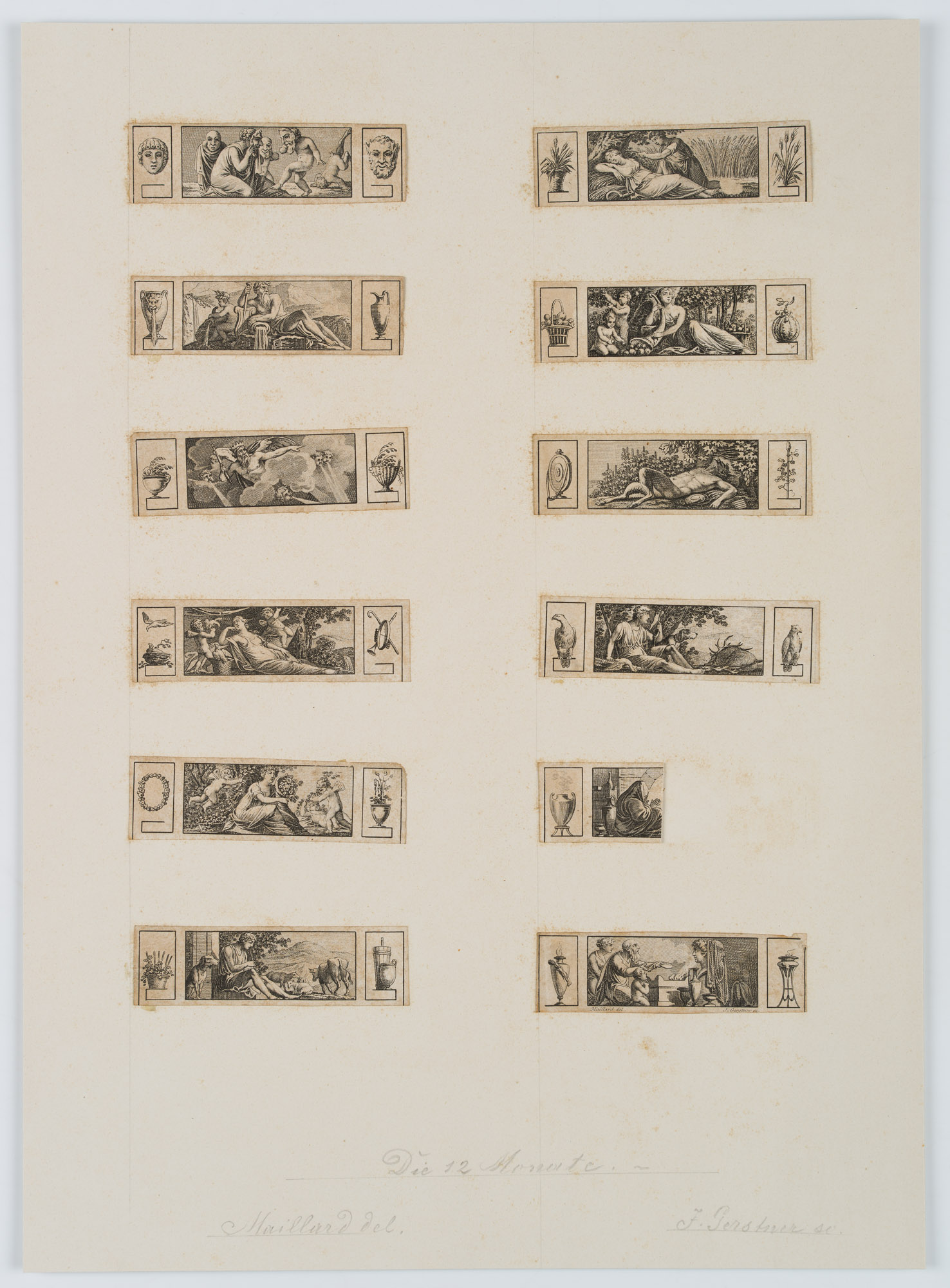 - Description: Signed “Maillard del” and “J Gerstner sc.” below the lowest print on the right. On the reverse side with the corresponding name of the month.