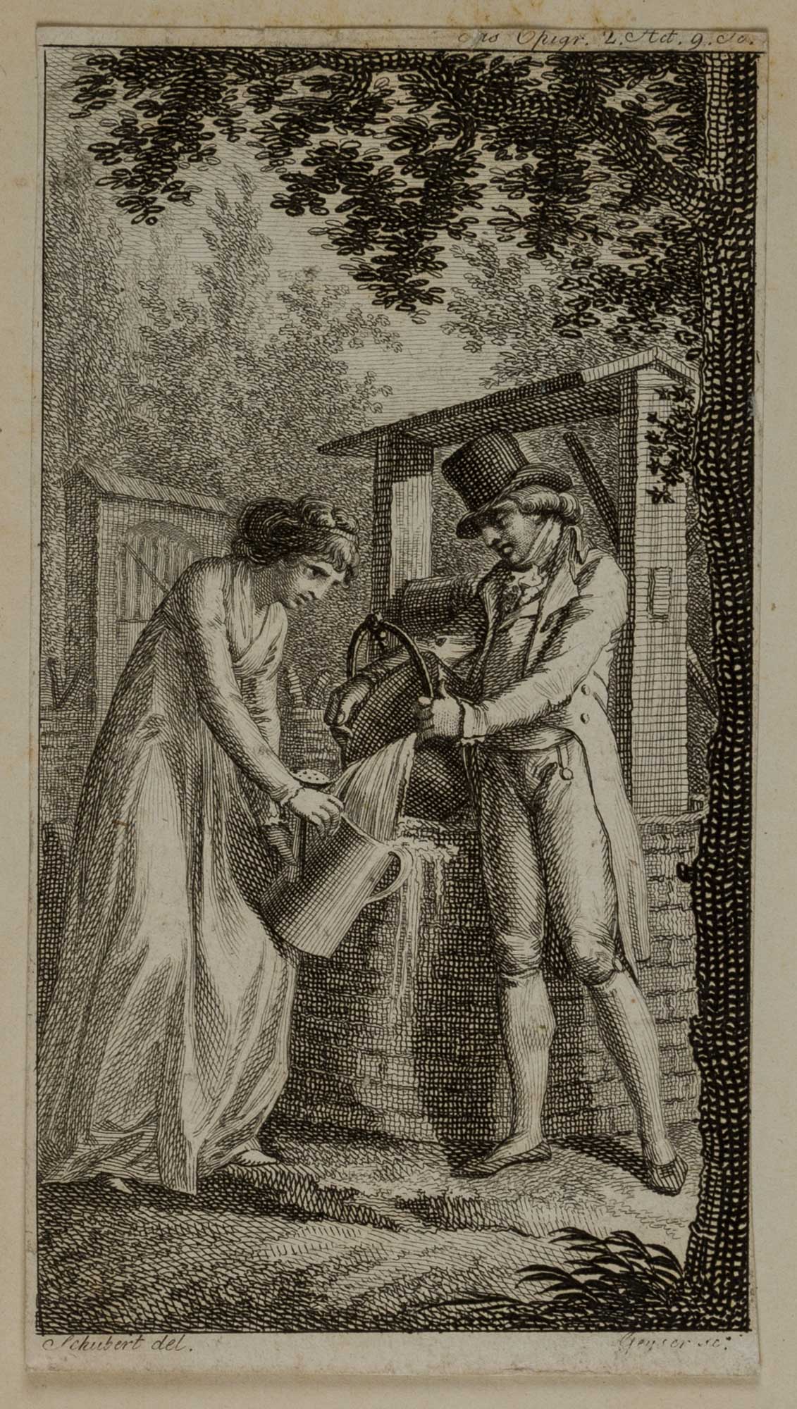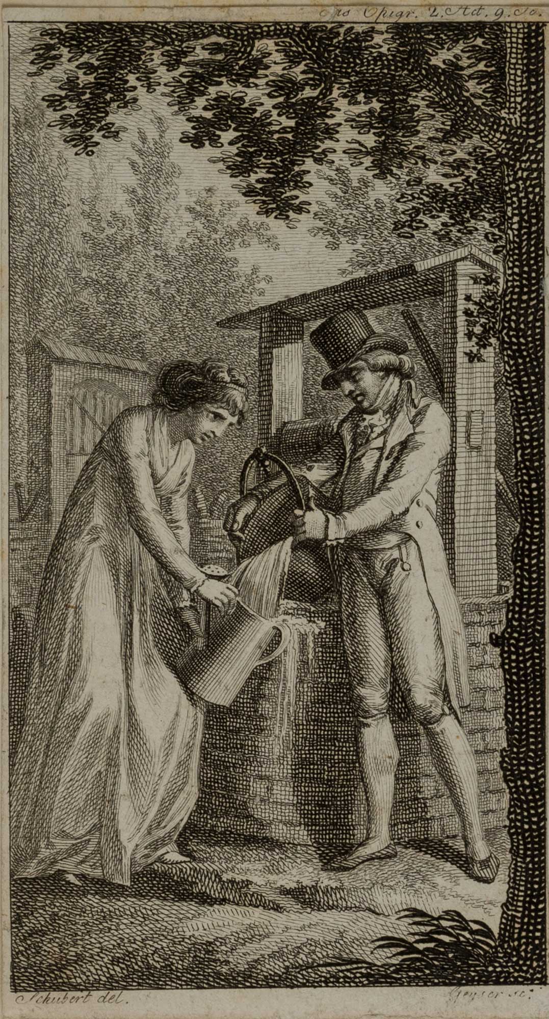 Christian Gottlieb Geyser (1742 Görlitz – 1803 Leipzig) nach Johann David Schubert (1761 Dresden – um 1822 ebd.), Theaterszene, Am Brunnen, Sammlung Hasselmann, , Radierung