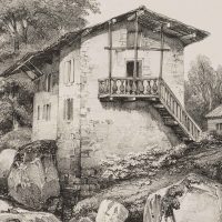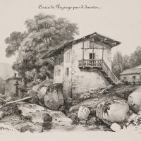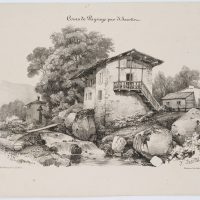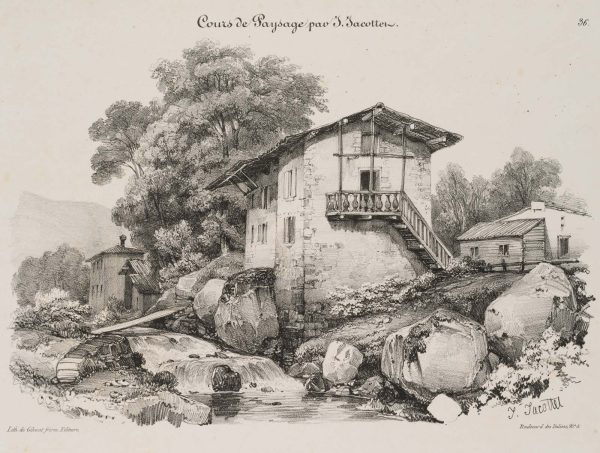 Gihaut (19th century) after Jean Jacottet (1806 Paris – 1880 ibid.), “Cours de Paysage”, landscape study, house on a mountain river, 1850, Lithography