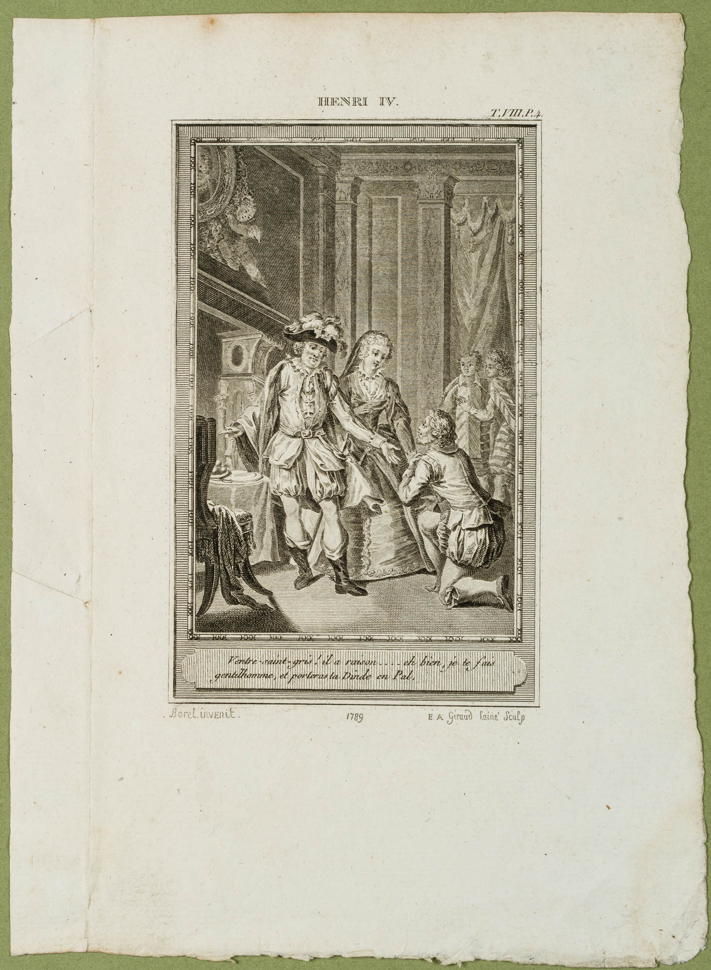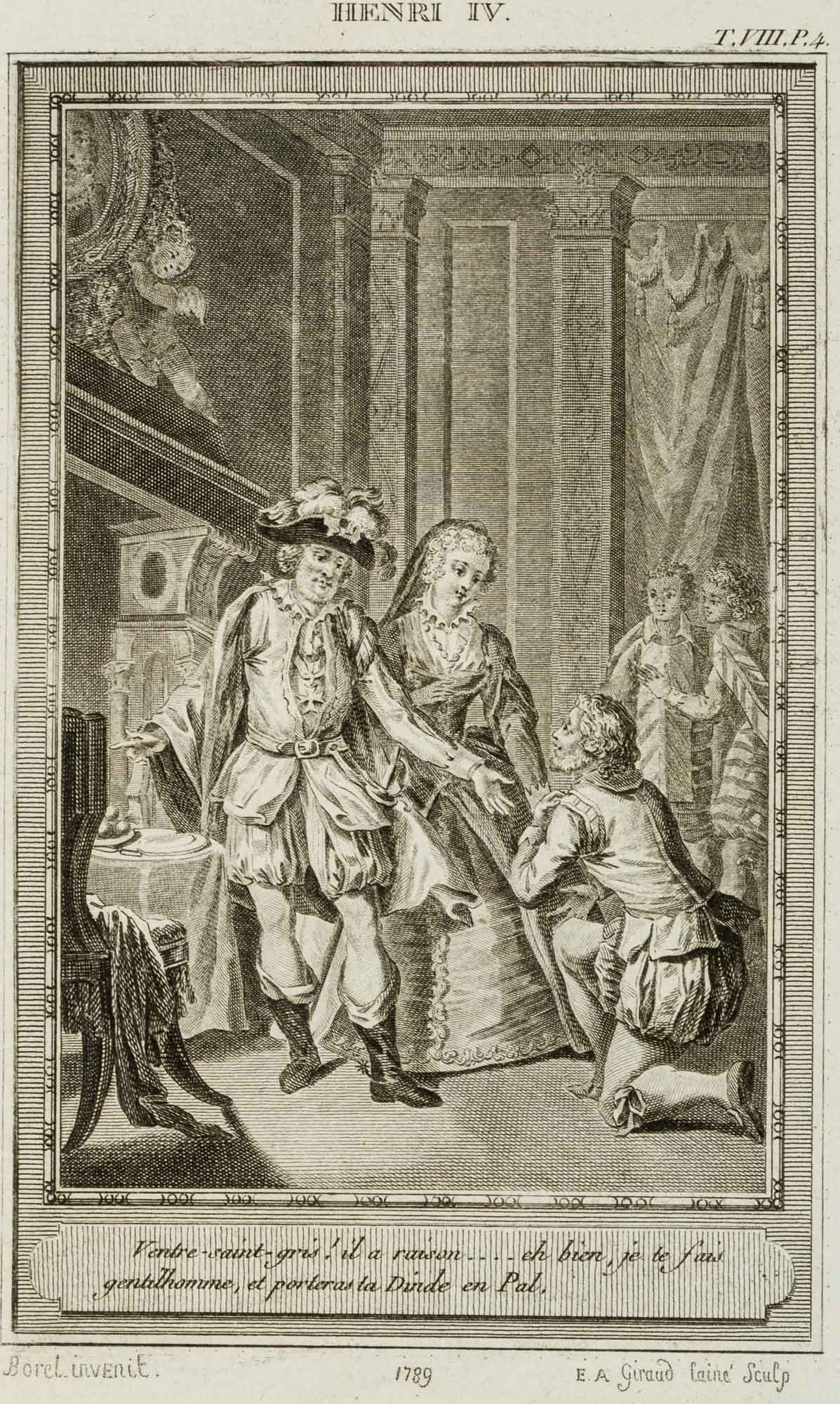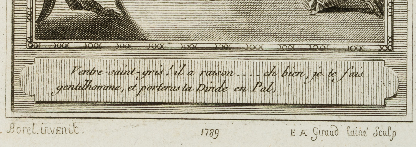 • Inscription: Signed on the left under the print: “Borel invenit.” and on the right “E. A. Giraud laine Sculp”. Dated: “1789”. The print bears the caption: “Ventre-saint-gris! il a raison … eh bien, je te fais gentilhomme, et porteras ta Dinde en Pal.”.