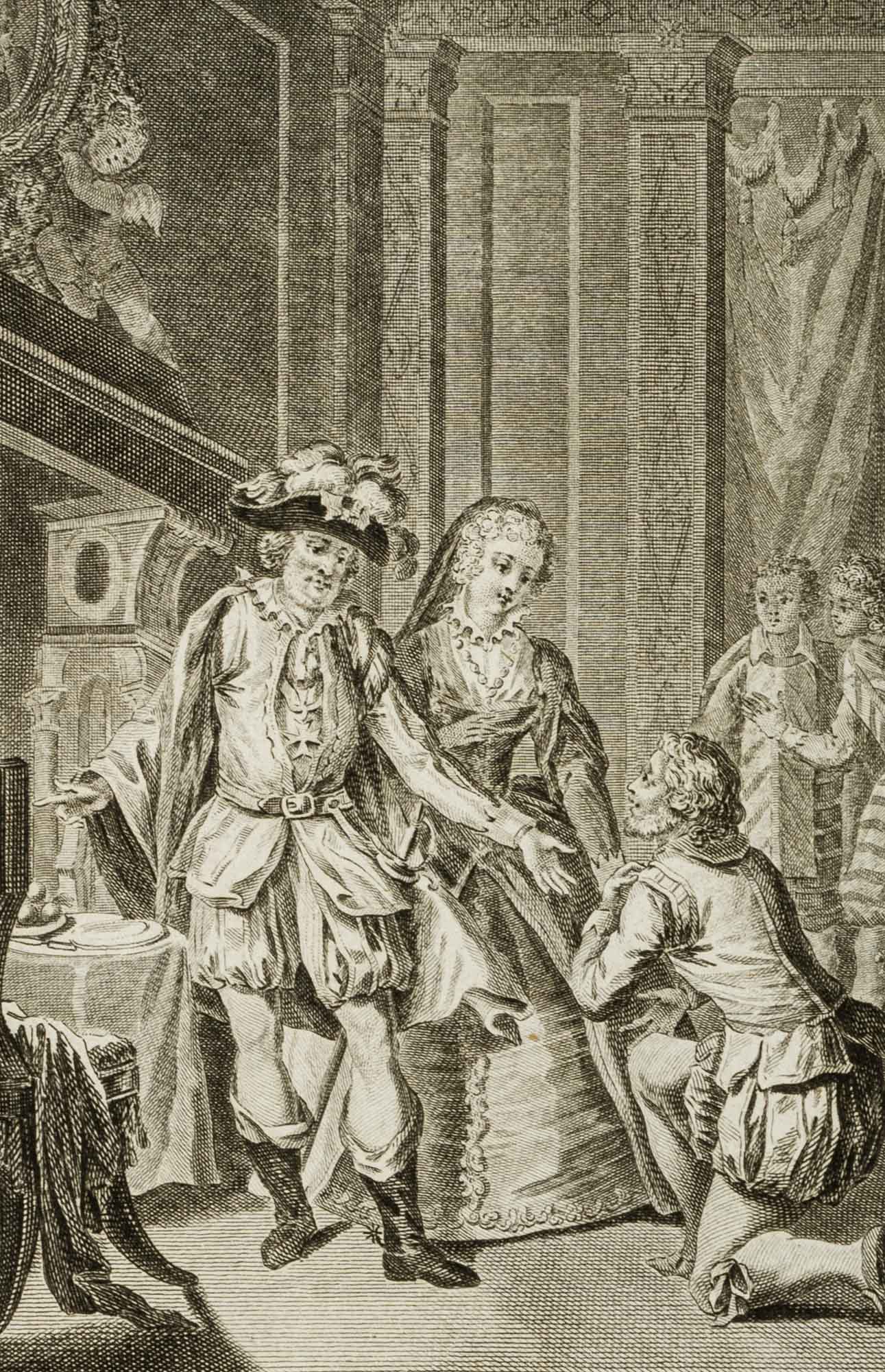 • Beschreibung: Kniender vor Henri IV und einer Dame. Oberhalb betitelt mit “Henri IV.”, daneben nummeriert auf: “T.VIII.P.4.”.