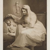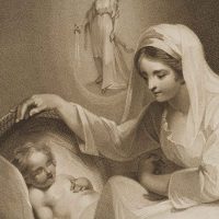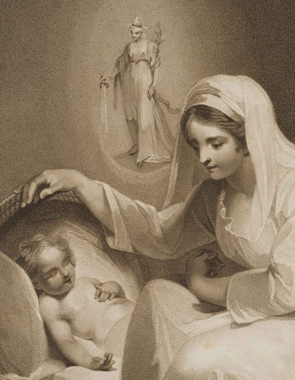 - Description: A young woman sits – rocking a sleeping baby in a wicker cradle with one hand – looking down meditatively; in the background with a female allegorical figure in a circle of light, pouring water from a vase and holding a green branch.