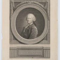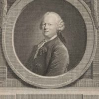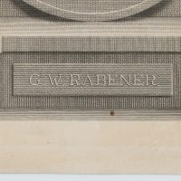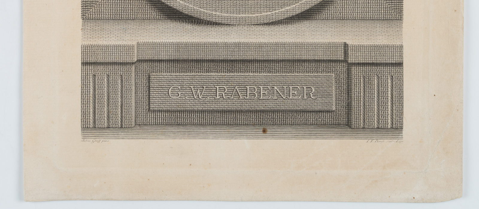 - Beschreibung: Mit dem Namen des Dargestellten auf einer Schrifttafel unterhalb des runden Portraits. Darunter links und rechts in der Druckplatte signiert.