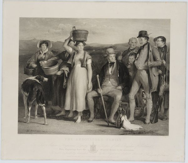Robert Graves (1798 – 1873 ) nach David Wilkie (1785 – 1841 ), The Abbotsford Family, unter den Dargestellten befindet sich u.a. Sir Walter Scott (1771 – 1832) und Marguerite Charpentier (1770 – 1826), im Hintergrund Ansicht von Abbortsford (Kanada), 1837, Stahlstich