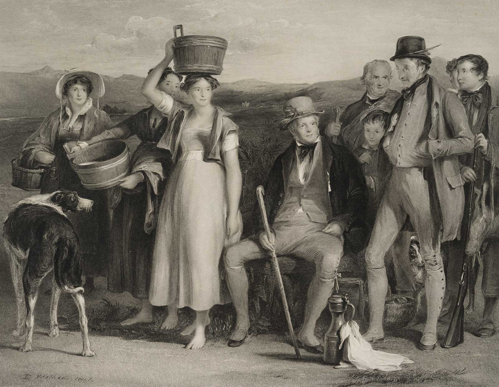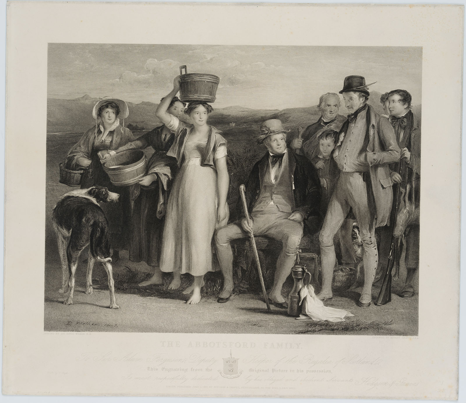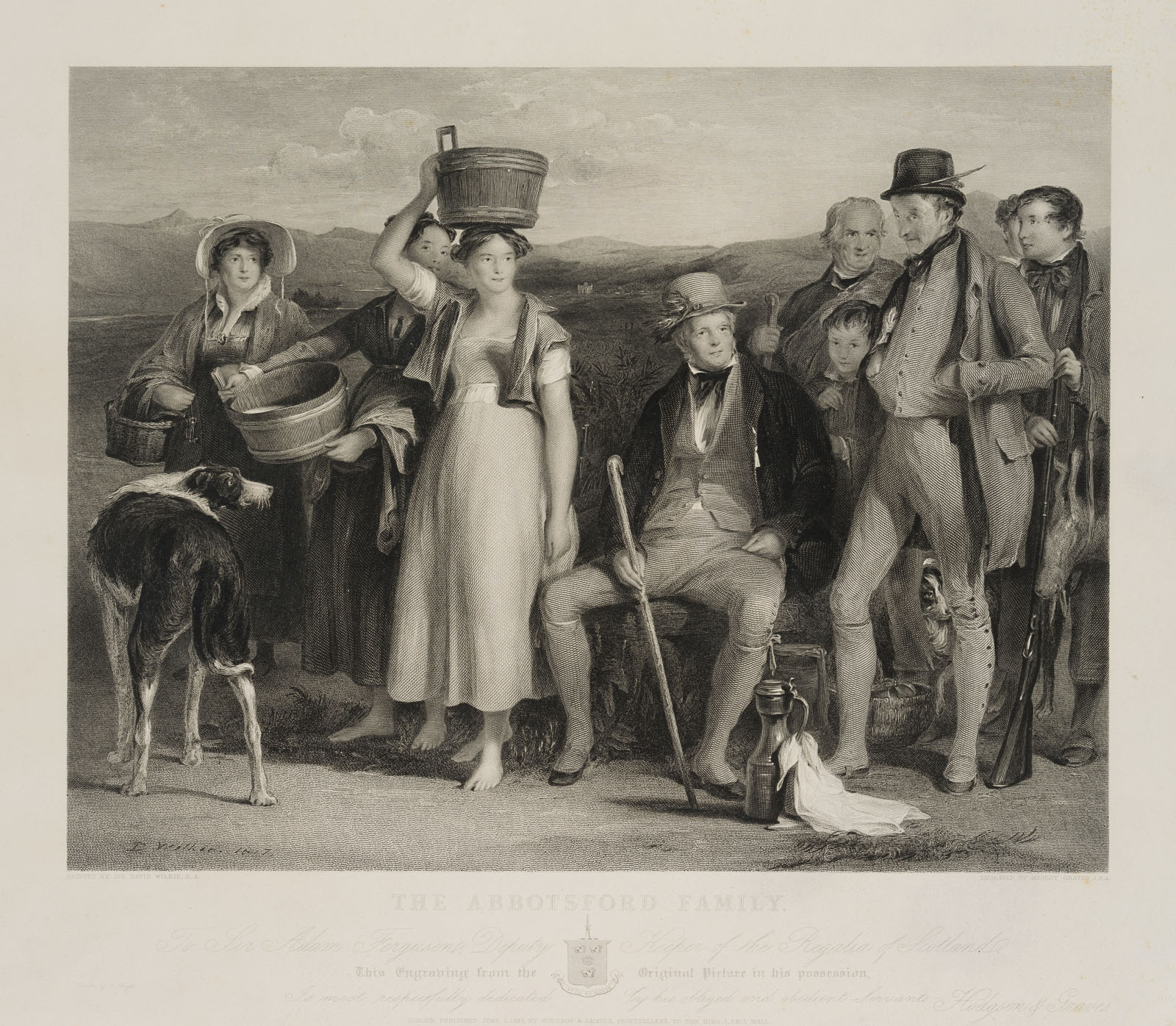 Robert Graves (1798 – 1873 ) after David Wilkie (1785 – 1841 ), The Abbotsford Family, among the sitters are Sir Walter Scott (1771 – 1832) and Marguerite Charpentier (1770 – 1826), in the background a view of Abbortsford (Canada), 1837, Steel engraving