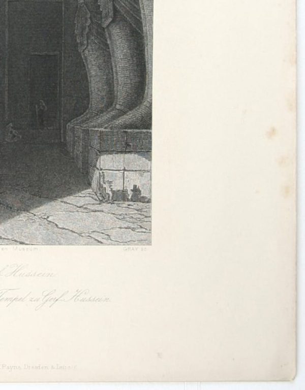 - Description: Grey, Temple at Gerf Hussein, steel engraving after Schirmer, c. 1860. Description: Steel engraving by Grey after Schirmer, inscribed: “Schirmer pinx Wandgemälde im neuen Museum Gray sc. Temple Gerf-Hussein Temple at Gerf-Hussein Temple zu Gerf-Hussein Published for the Proprietors by A. H. Payne, Dresden&Leipzig”. Rock hall of the temple of Gerf Hussein with monumental statue pillars.