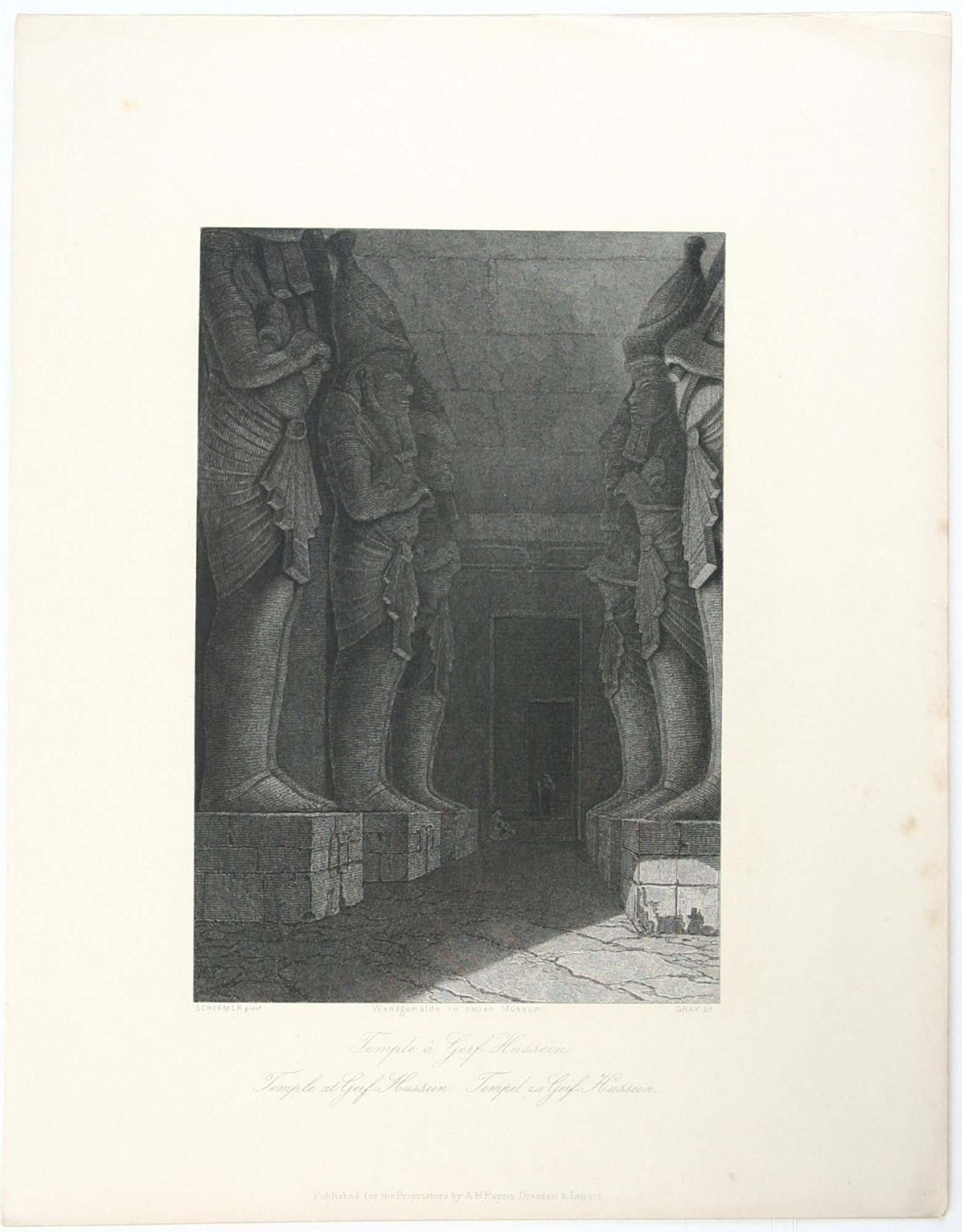 - Beschreibung: Grey, Tempel zu Gerf Hussein, Stahlstich nach Schirmer, um 1860. Beschreibung: Stahlstich von Grey nach Schirmer, bezeichnet: “Schirmer pinx Wandgemälde im neuen Museum Gray sc. Temple à Gerf-Hussein Temple at Gerf-Hussein Tempel zu Gerf-Hussein Published for the Proprietors by A. H. Payne, Dresden&Leipzig”. Felsensaal des Tempels von Gerf Hussein mit monumentalen Statuenpfeilern.