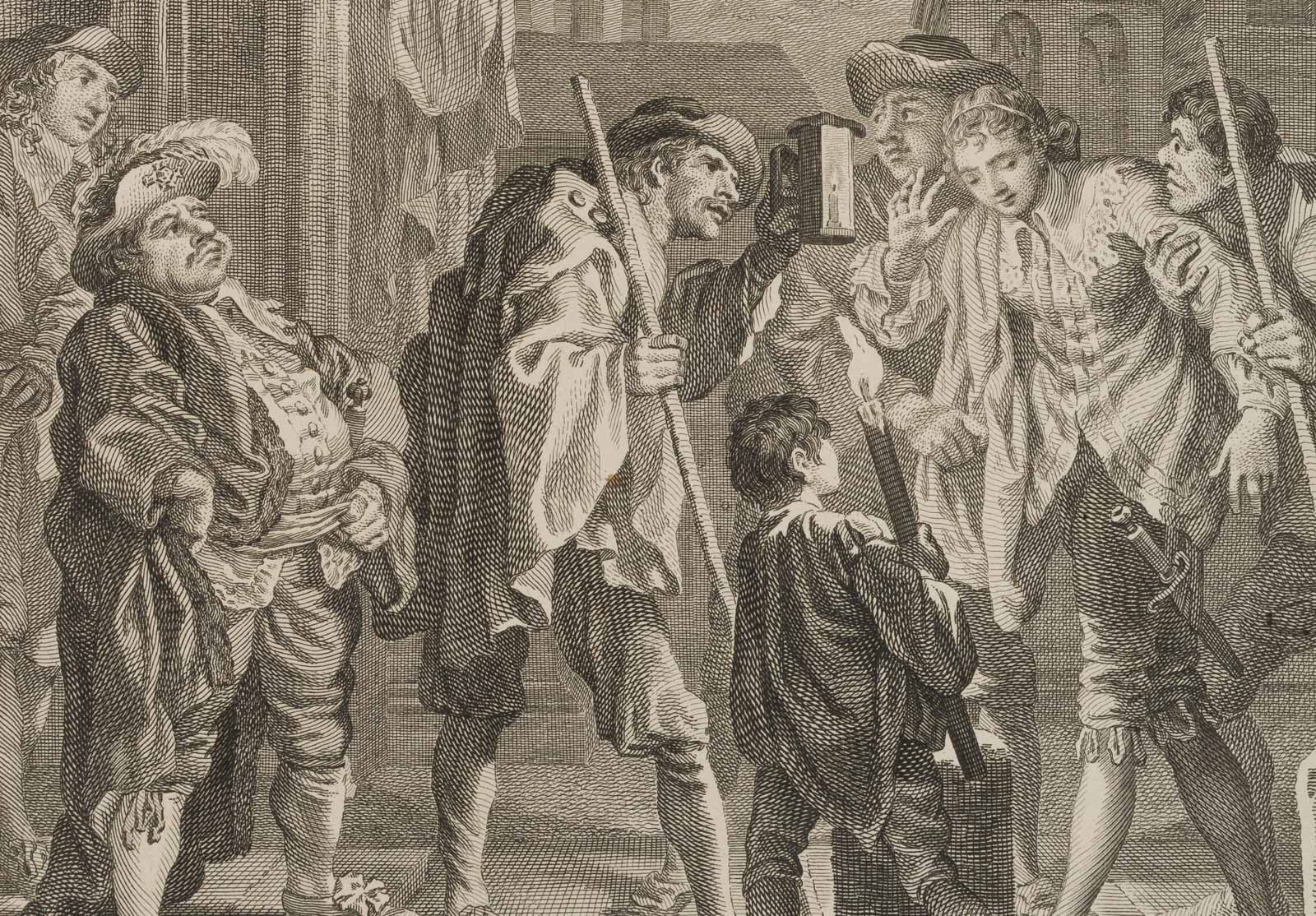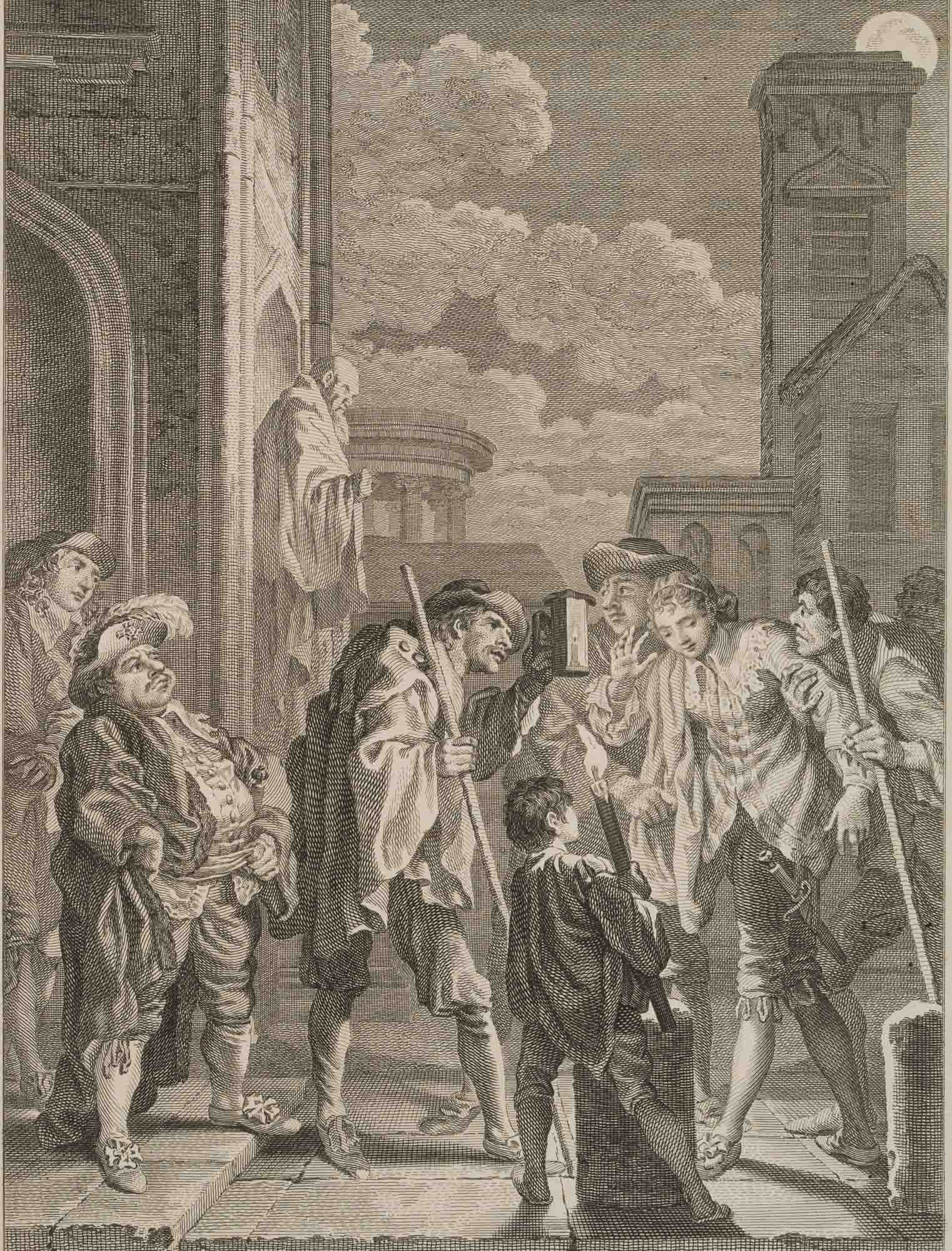 Charles Grignion (1717 London – 1810 ibid.) after Francis Hayman (1708 Exeter – 1776 London), Illustration Shakespeare? Mustering of a nobleman being led away by two men, 19th century, Copper engraving