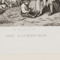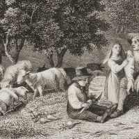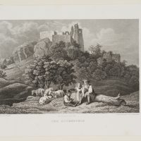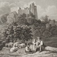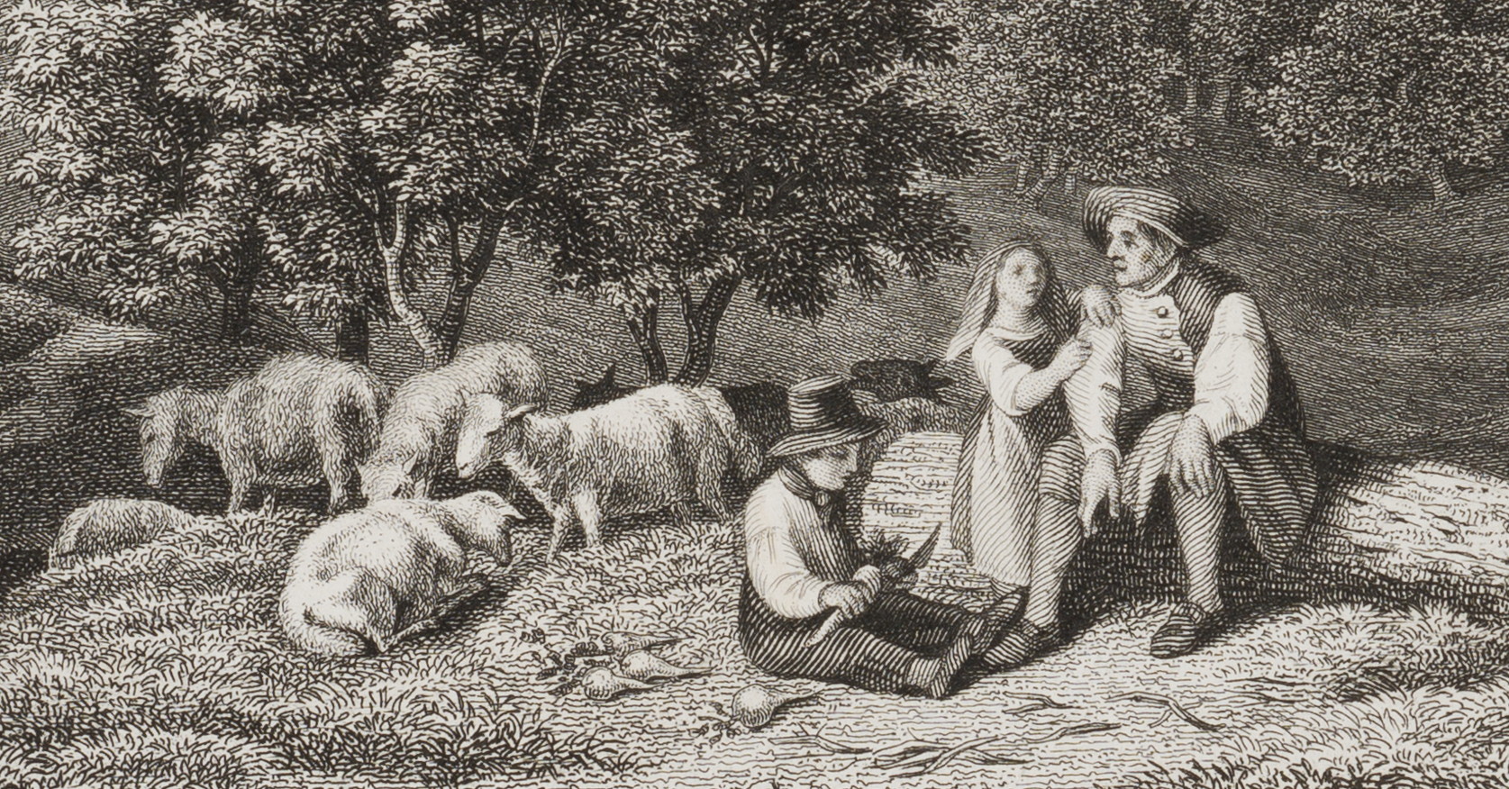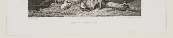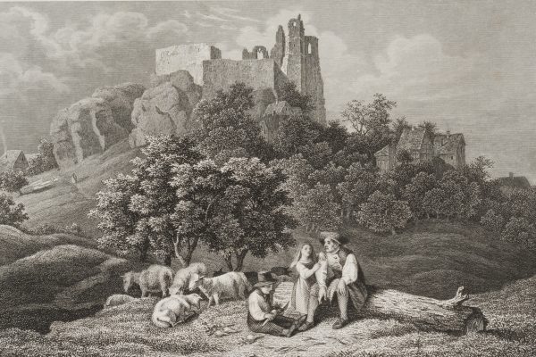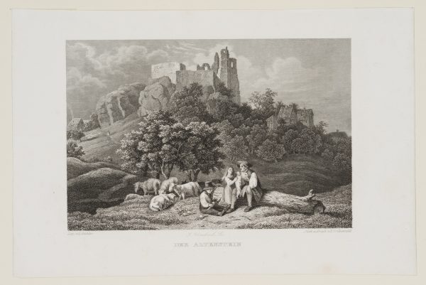 Ernst Friedrich Grünewald (1801 Darmstadt – 1848 ibid.) after Ludwig Richter (1803 Dresden – 1884 ibid.), The Altenstein A resting father with children and sheep in front of the ruins of Altenstein Castle, Franconia, 19th century, Steel engraving