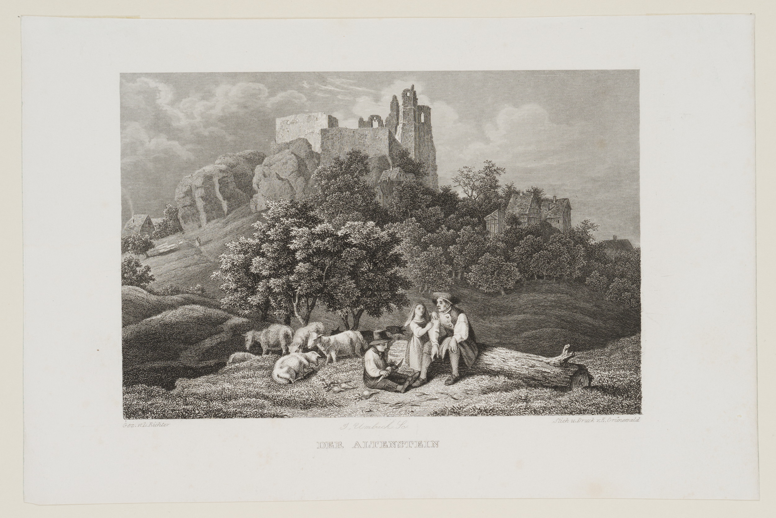 Ernst Friedrich Grünewald (1801 Darmstadt – 1848 ebd.) nach Ludwig Richter (1803 Dresden – 1884 ebd.), Der Altenstein. Rastender Vater mit Kindern und Schafen vor der Ruine der Burg Altenstein, Franken, 19. Jahrhundert, Stahlstich