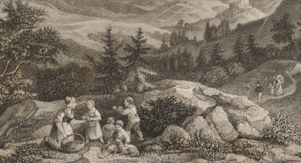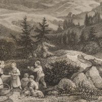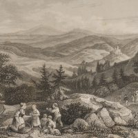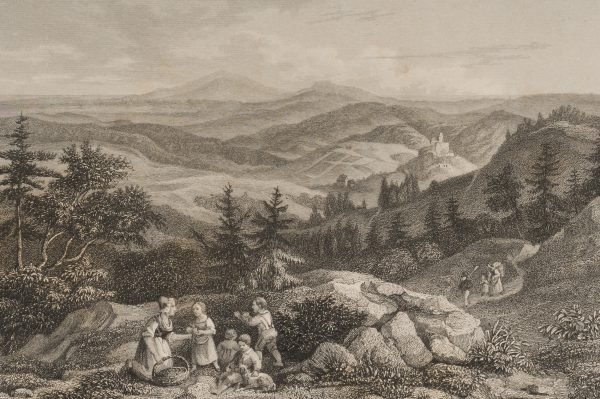 Ernst Friedrich Grünewald (1801 Darmstadt – 1848 ibid.) after Ludwig Richter (1803 Dresden – 1884 ibid.), The Zobtenberg Panoramic view over the mountain massif with a resting family in the foreground, Lower Silesia, c. 1840, Steel engraving