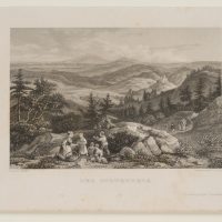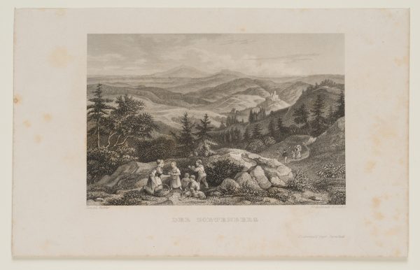 Ernst Friedrich Grünewald (1801 Darmstadt – 1848 ebd.) nach Ludwig Richter (1803 Dresden – 1884 ebd.), Der Zobtenberg. Panoramatischer Ausblick über das Berg-Massiv mit rastender Familie im Vordergrund, Niederschlesien, um 1840, Stahlstich
