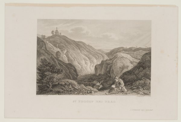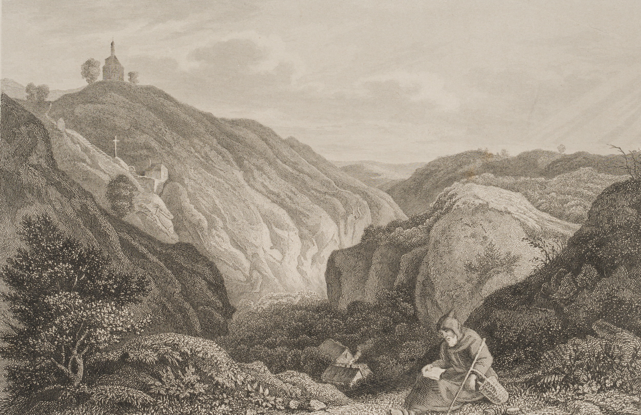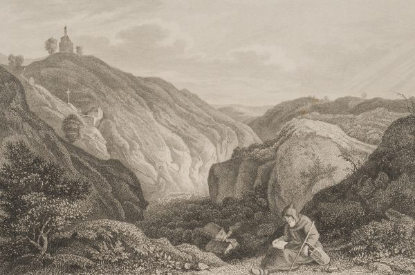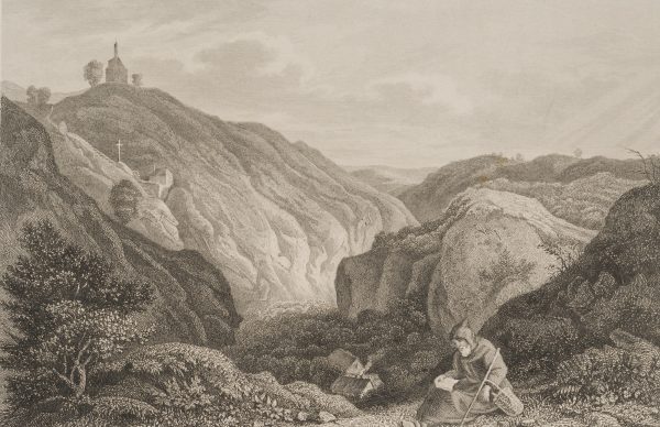 Ernst Friedrich Grünewald (1801 Darmstadt – 1848 ibid.) after Ludwig Richter (1803 Dresden – 1884 ibid.), St Procop near Prague View over wooded mountainous countryside with a pilgrimage church in the distance and a resting monk doing some pious reading in the foreground, c. 1840, Steel engraving