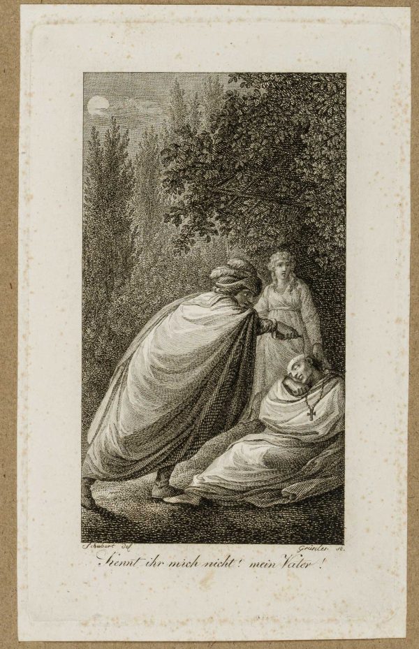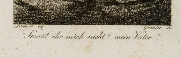 - Inscription: Signed “Schubert del” on the lower left and “Grünler sc.” on the right. Inscribed below with “Don’t you know me! my father!”.