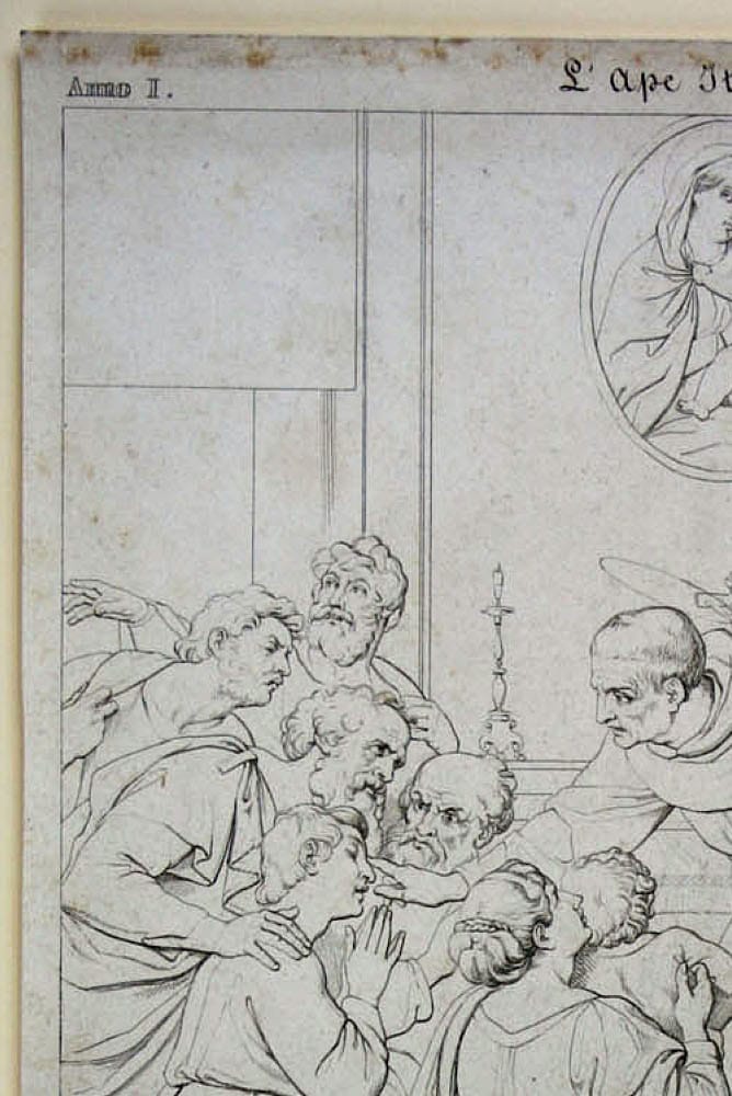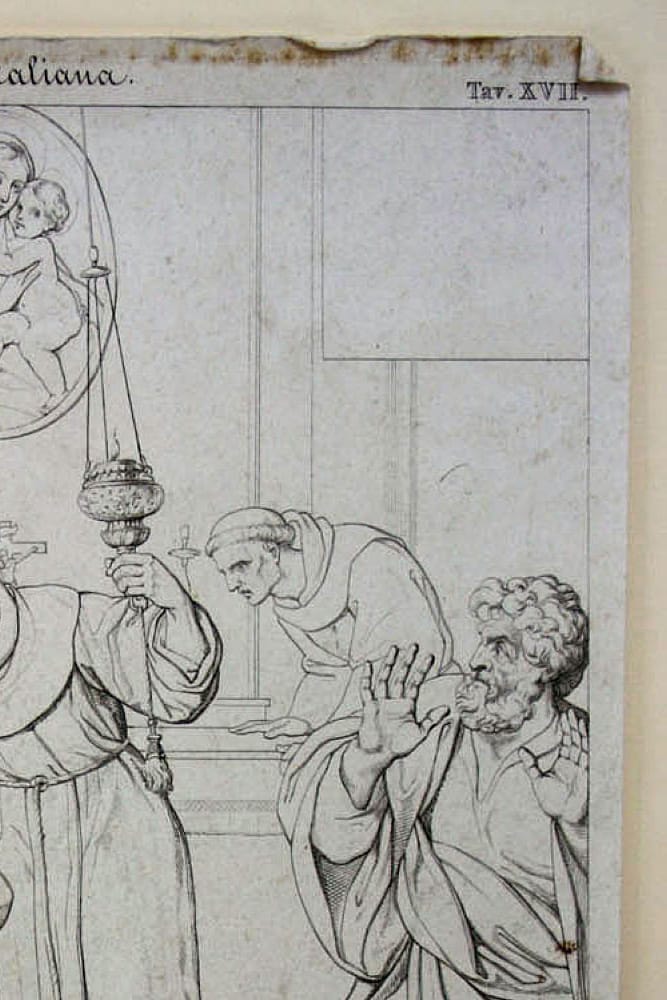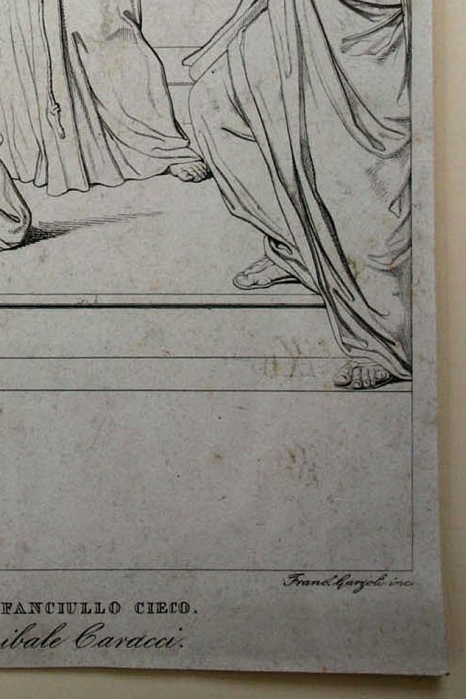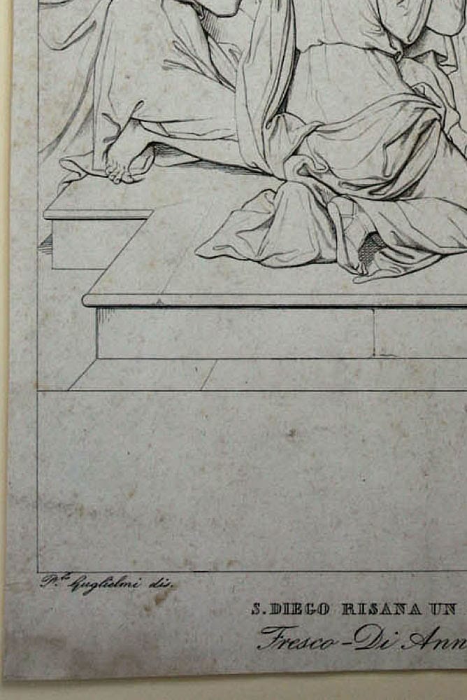 - Beschreibung: Paolo Guglielmi, S. Diego heilt einen blinden Jüngling, Kupferstich nach Francesco Garzoli, um 1835. Beschreibung: Kupferstich von Paolo Guglielmi, bezeichnet oben: ” Anno I. L`Ape Italiana Tav. XVII. “, unten: “Plo. Guglielmi dis. Franc. Garzoli inc. S. Diego risana un fanciulli cieco. Fresco – Di Annibale Caracci”. Vor einem Altar beugt sich S. Diego zu einem vor ihm knienden Jüngling und berührt dessen geschlossene Augen. Gleichermaßen gespannt und erschrocken verfolgen die Umstehenden das Geschehen. Paolo Guglielmi (Rom 1804 – Rom 1862) war italienischer Lithograph, Kupferstecher und Zeichner. Er war u. a. in Rom und Madrid tätig.
