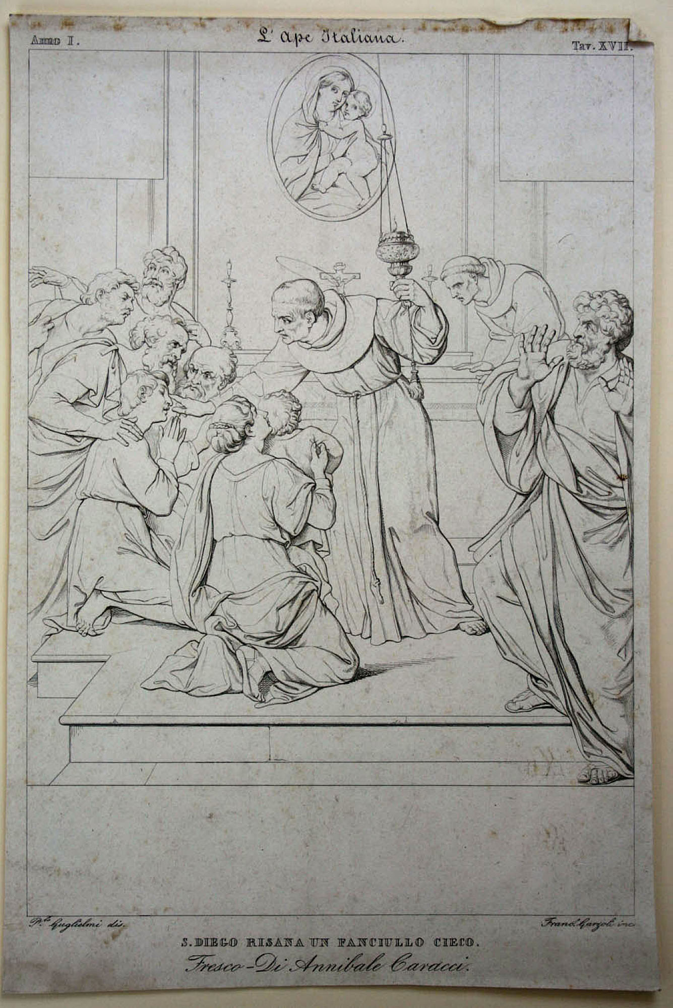 - Description: Paolo Guglielmi, S. Diego heals a blind youth, copper engraving after Francesco Garzoli, c. 1835. Description: Copper engraving by Paolo Guglielmi, inscribed above: ” Anno I. L`Ape Italiana Tav. XVII. “, below: “Plo. Guglielmi dis. Franc. Garzoli inc. S. Diego risana un fanciulli cieco. Fresco – Di Annibale Caracci”. In front of an altar, S. Diego bends down to a young man kneeling before him and touches his closed eyes. The bystanders watch the scene with equal amounts of excitement and shock. Paolo Guglielmi (Rome 1804 – Rome 1862) was an Italian lithographer, engraver and draughtsman. He worked in Rome and Madrid, among other places.