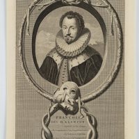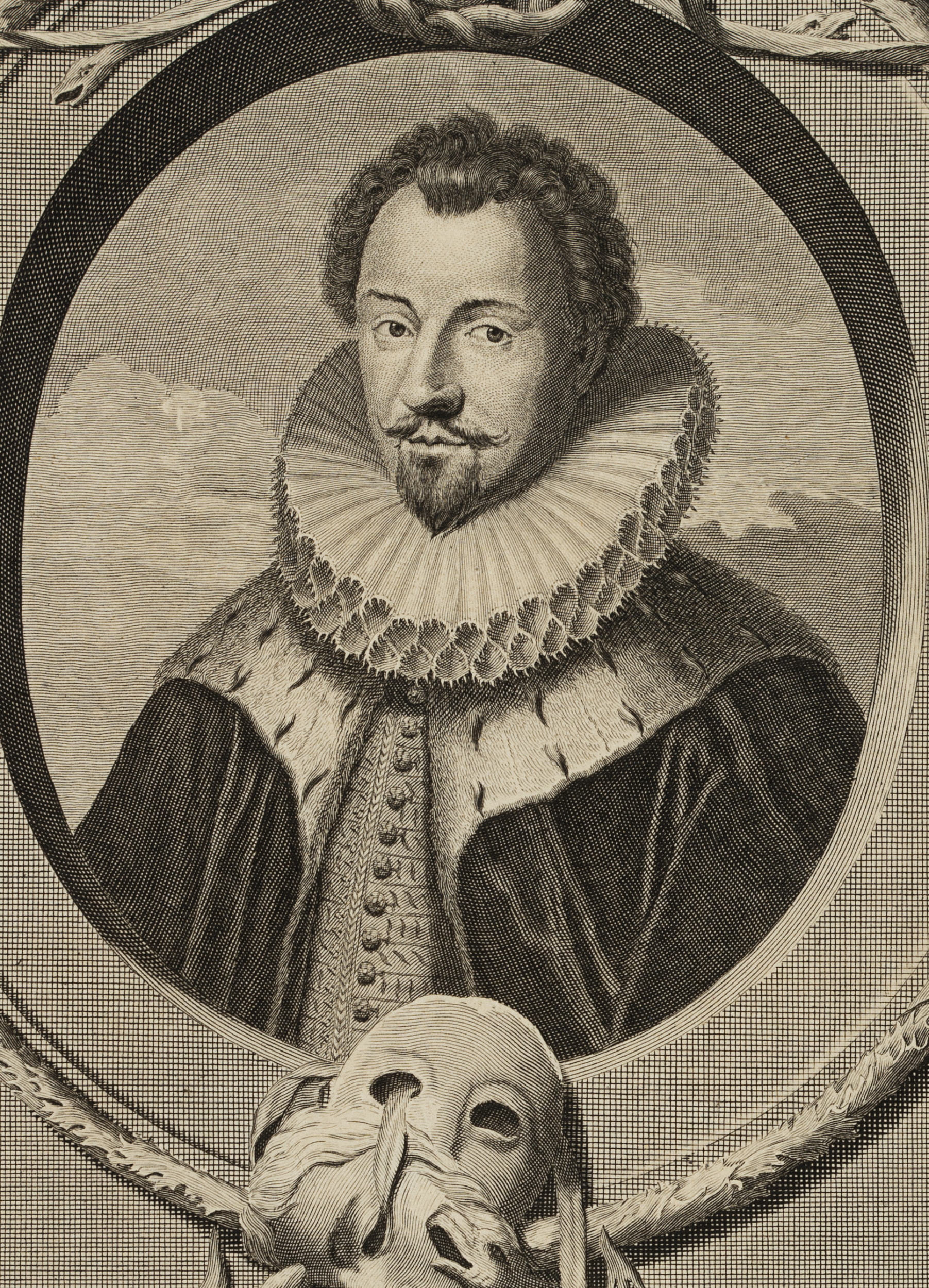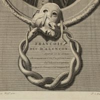 - Description: Depiction of the young Prince of France as a bust in half profile. In the frame theatre masks and snakes.