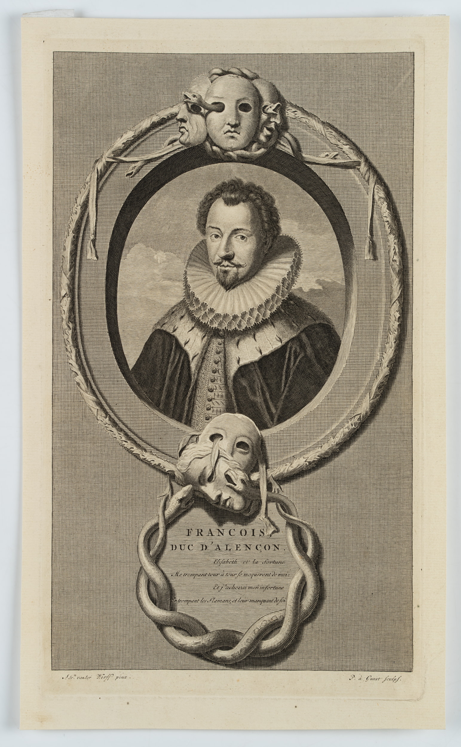 Pieter van Gunst (um 1659 Amsterdam – 1731 ebd.) nach Adriaen van der Werff (1659 Rotterdam – 1722 ebd.), Porträt Duc d’Alençon, François-Hercule de Valois (1555-1584), 18. Jahrhundert, Kupferstich