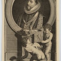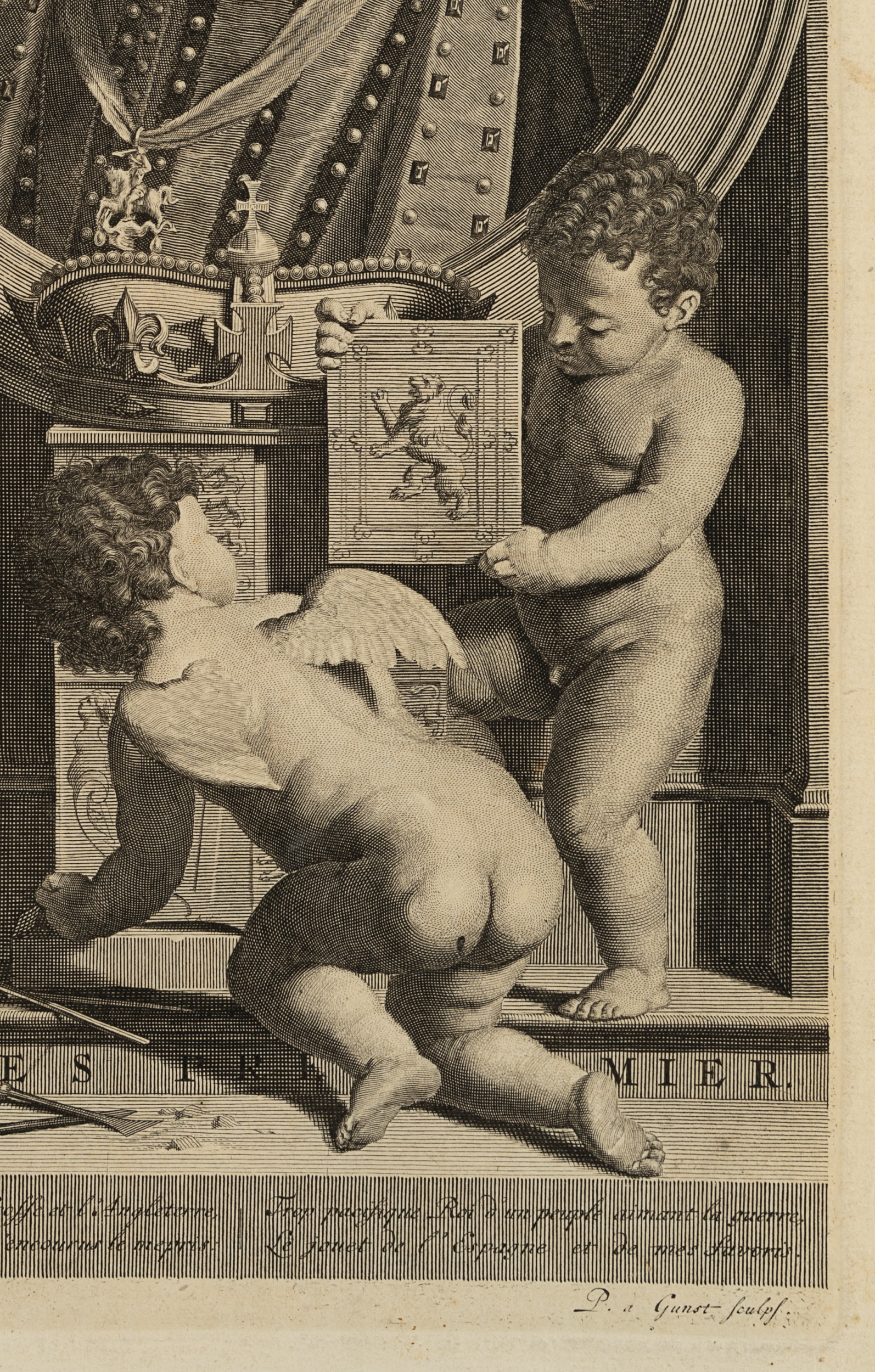 - Description: Half-length portrait in a round frame. Below putti with crown and arms of the King of England, Scotland and Ireland.