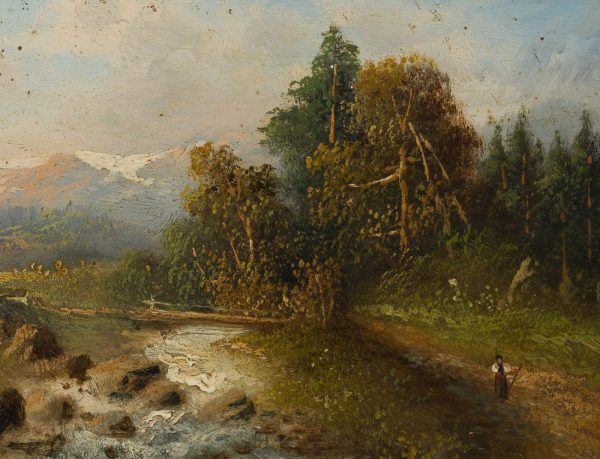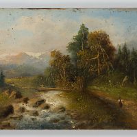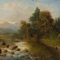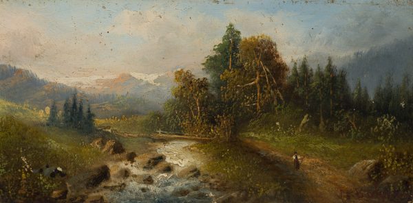 Hans Bachmann (1852 Winikon – 1917 Lucerne), Wide alpine landscape with river course and shepherds, 19th century, Oil