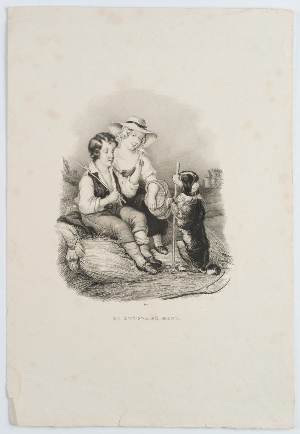 H. J. Backer (19. Jahrhundert), ‘De leerzame Hond’, Ländliche Szene mit Kindern auf dem Stroh bei der spielerischen Dressur eines Hundes, um 1840, Lithographie